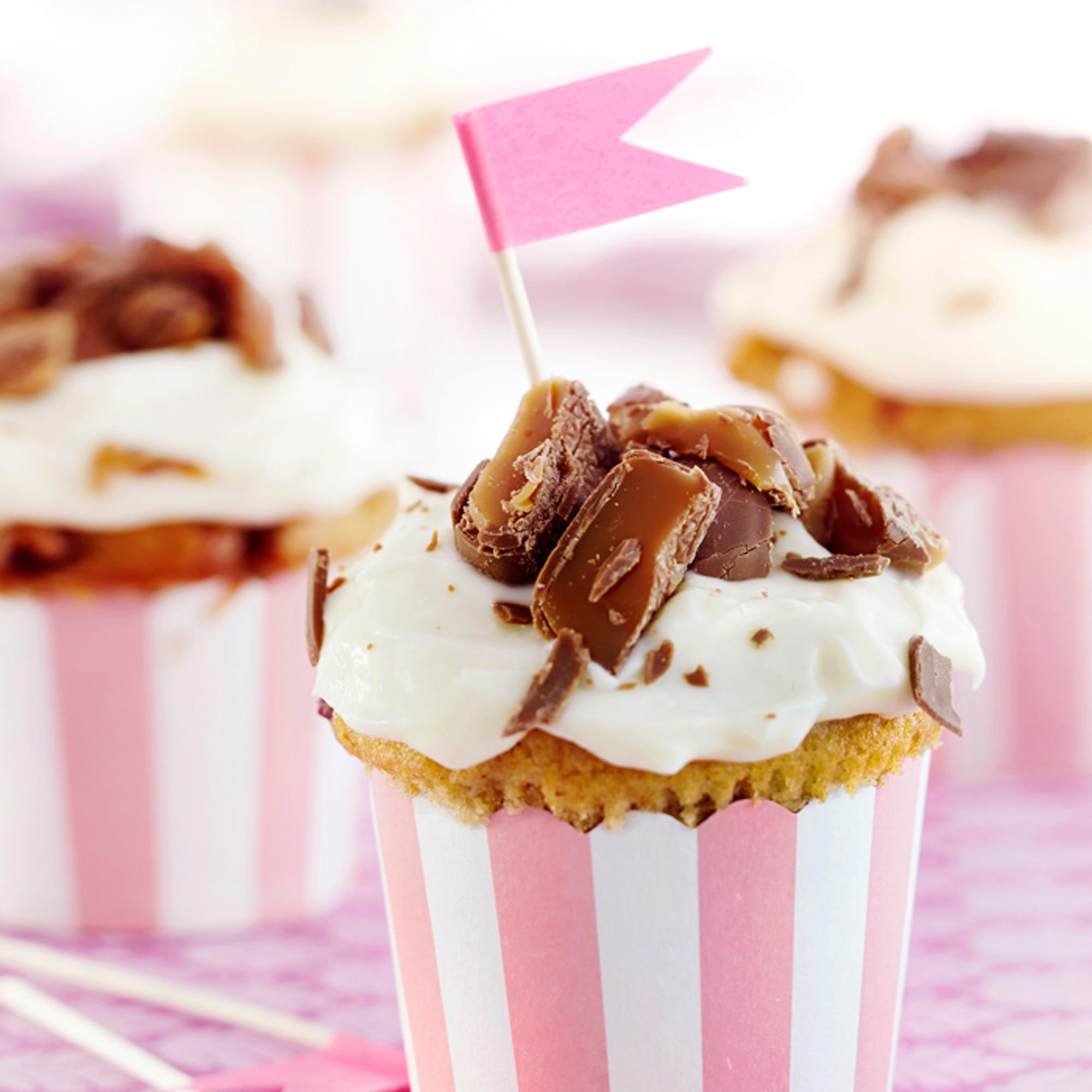 - Yhdistä kuorrutusta varten tuorejuusto, ranskankerma ja tomusokeri. Levitä tai pursota seos kuppikakuille. Koristele Dumle-kuppikakut karkkipaloilla.