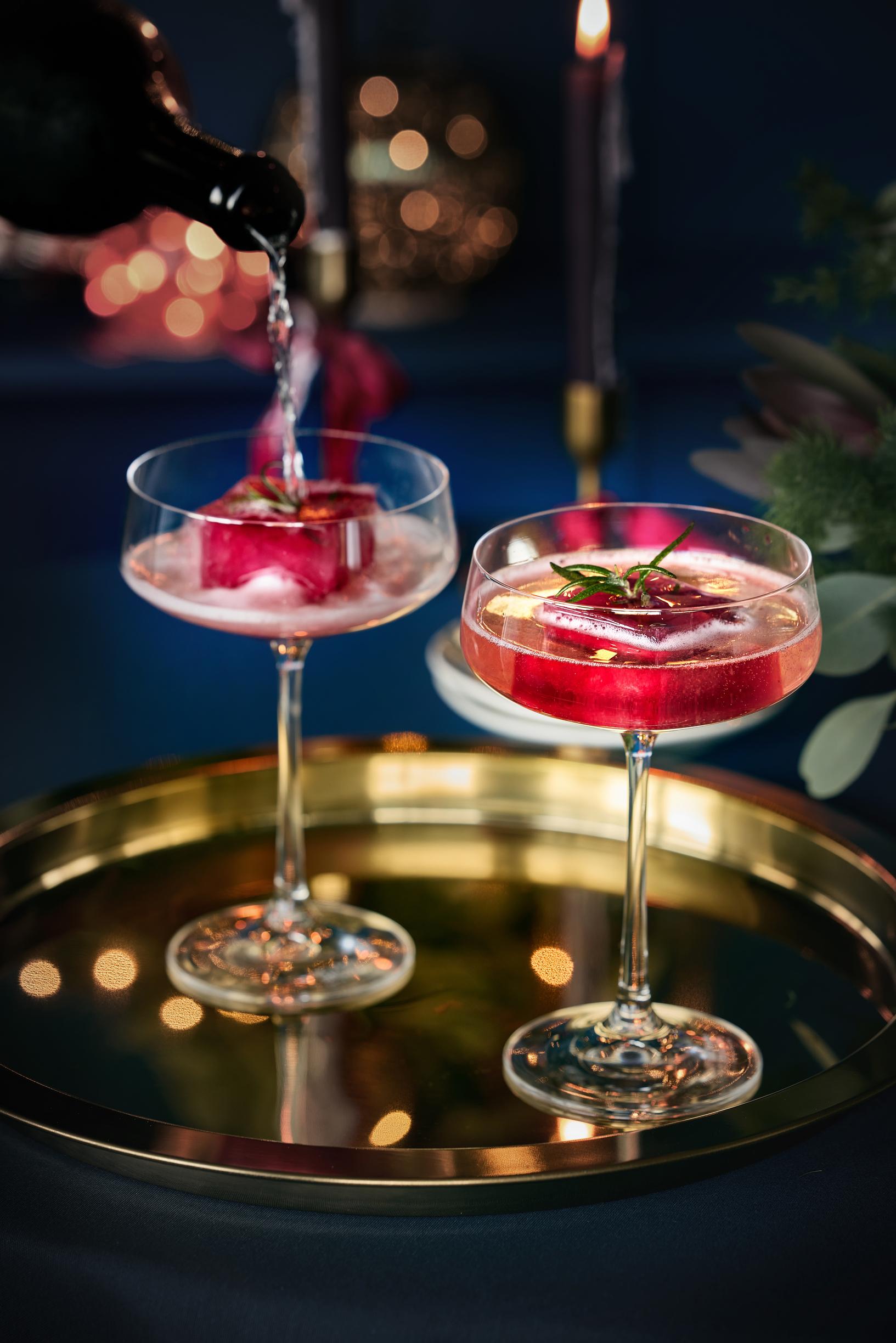 - Irrota jääpalat muotista ja jaa laakeisiin cocktaillaseihin. Kaada kuohuviini laseihin. Tarjoa heti.
