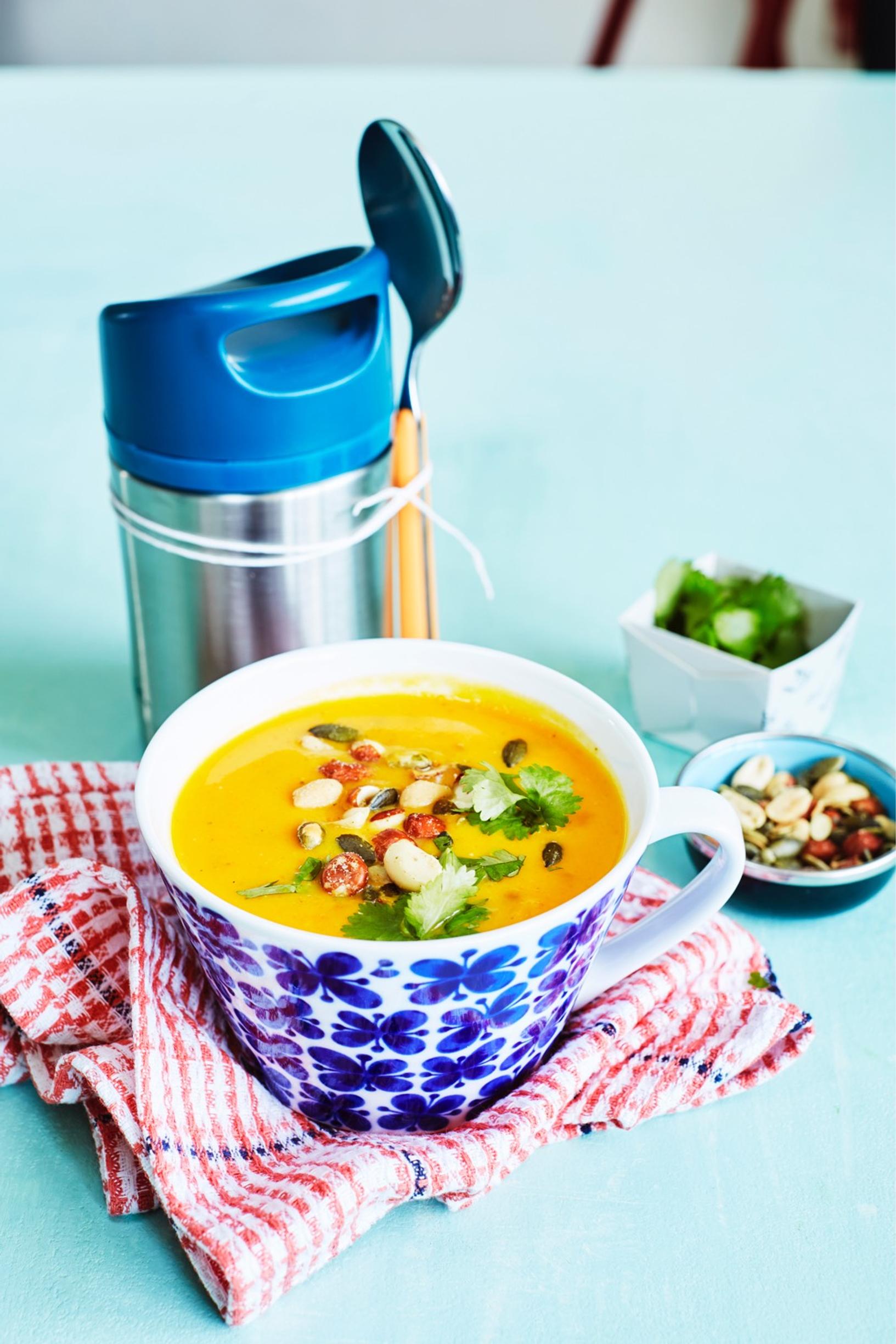 - Tee täyteläistä vegekeittoa samalla vaivalla iso annos ja kuljeta työpaikalle ruokatermoksessa. Voit pakata keiton myös kylmänä rasiaan ja lämmittää mikrossa. Ota lisäkkeet mukaan erillisessä astiassa.