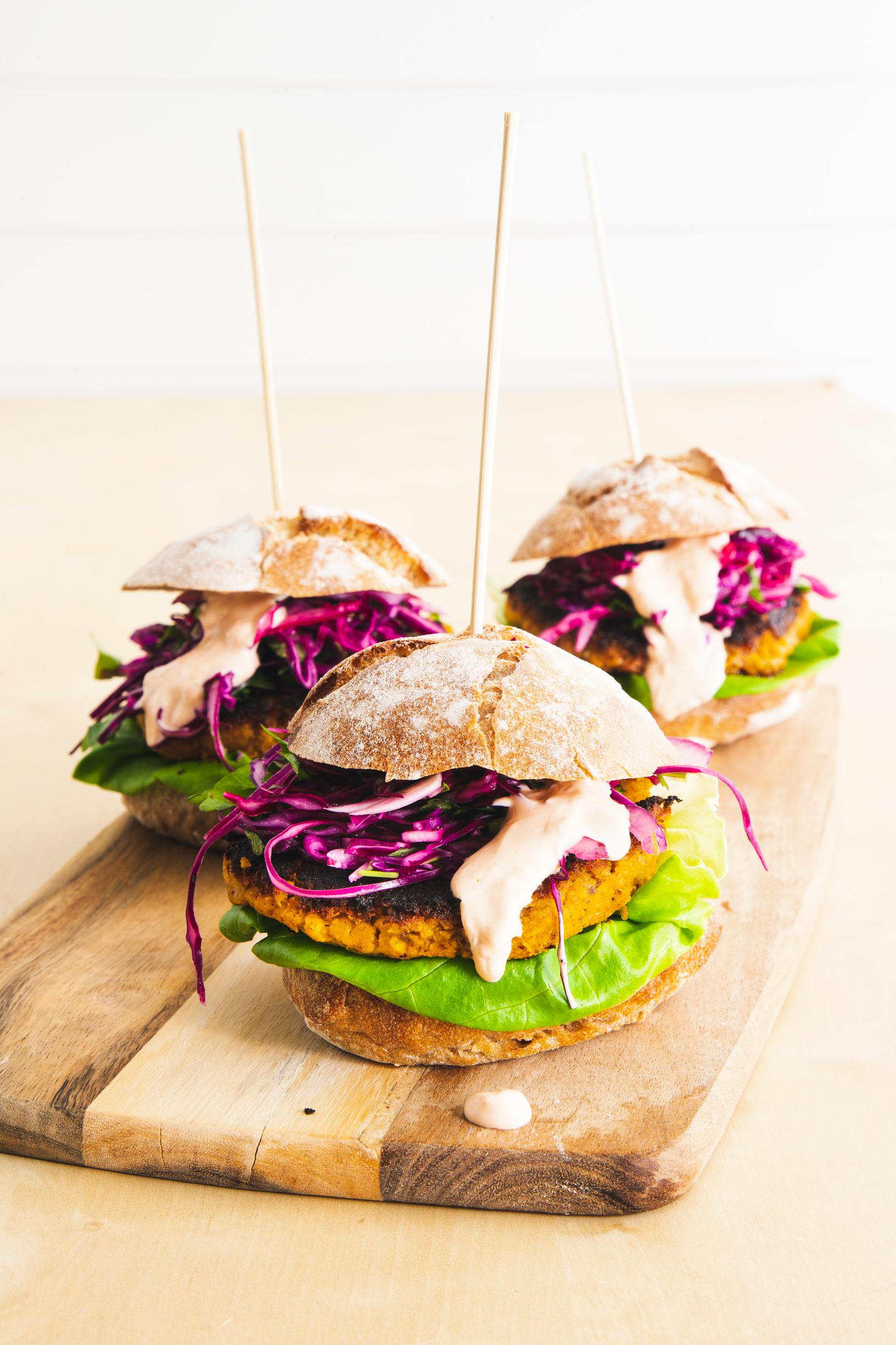 Kasvisburgerit – hampparisämpylän välissä piileskelee mehevä porkkana-kikhernepihvi seuranaan pikapikkelöityä kaalisalaattia