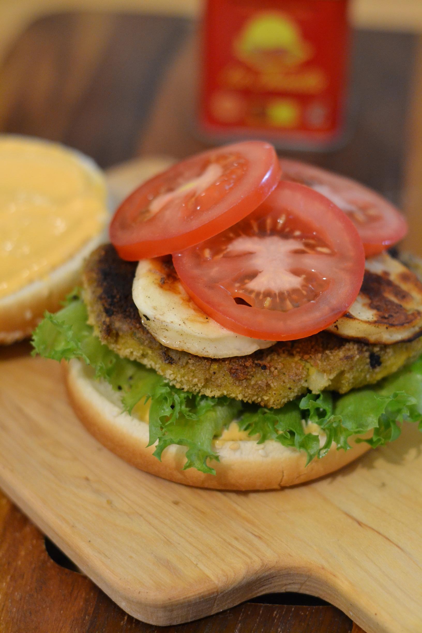 - Viipaloi halloumijuusto. Paista halloumijuusto viipaleet rapeiksi pannulla molemmilta puolilta. Kokoa hampurilaiset haluamillasi täytteillä ja nauti heti.