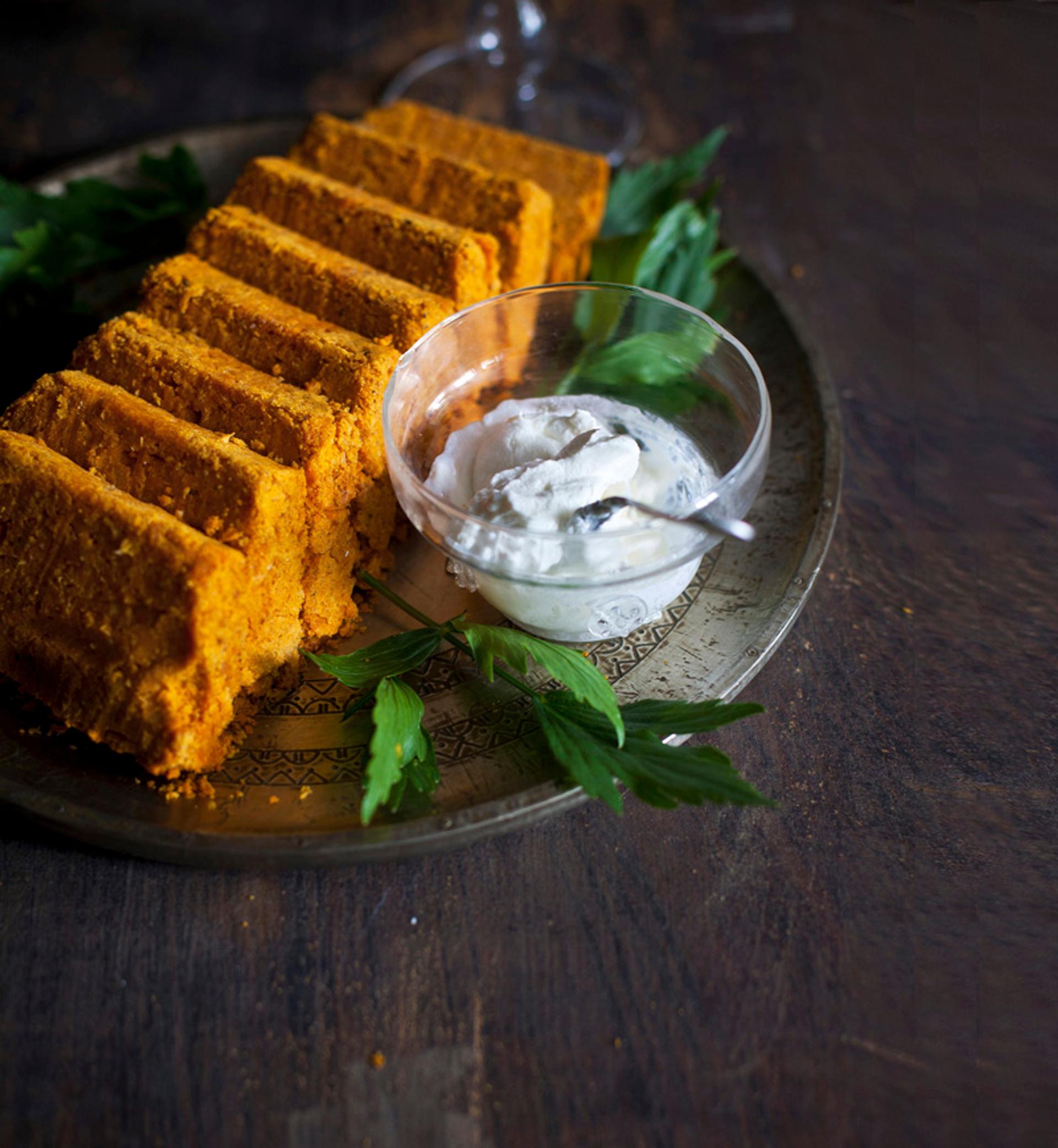 9. Nosta kasvismureke uunista, anna jäähtyä hetken aikaa vuoassa ja kumoa tarjoiluastialle. Nauti kikhernemureke lämpimänä tai kylmänä alkuruokana. Tarjoa seuraksi vegaanista kastiketta.