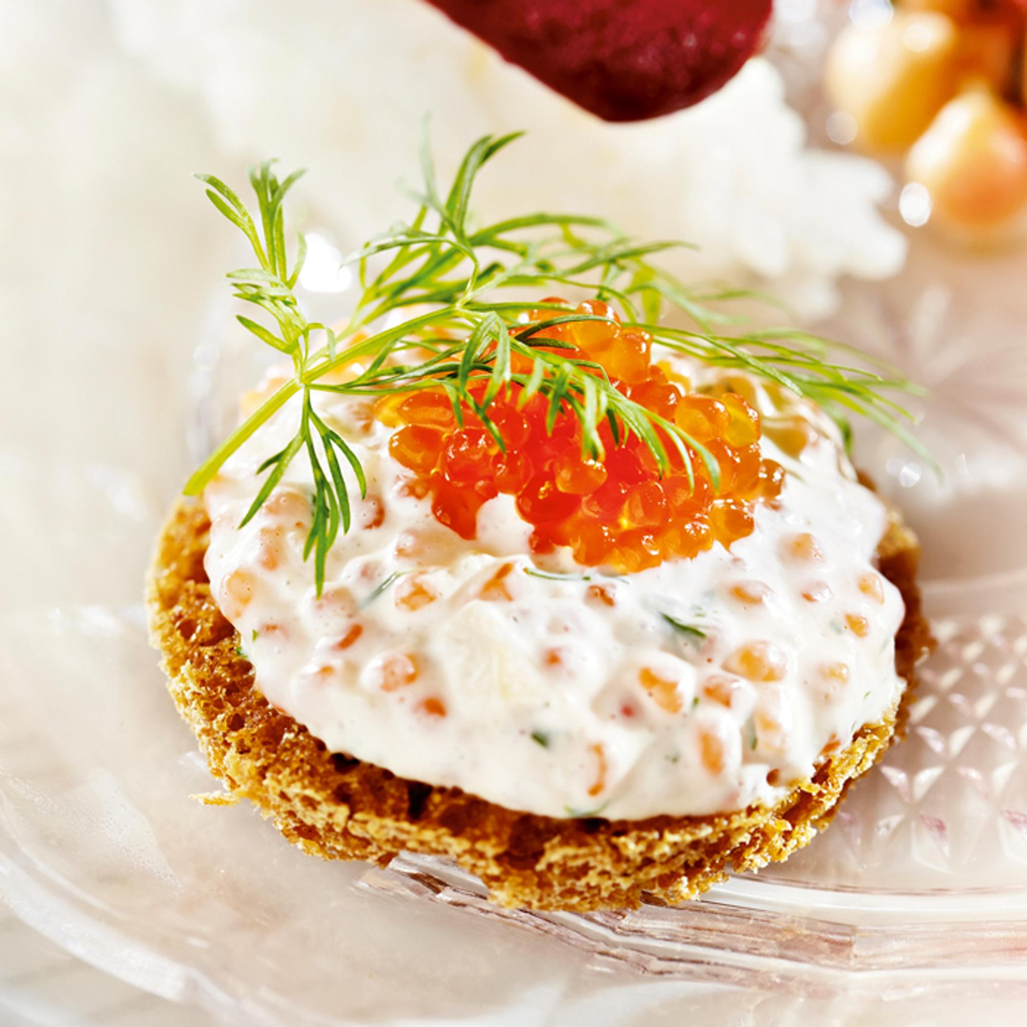Sekoita 1 1/2 dl levävalmistetta, smetana ja mausteet keskenään. Anna tekeytyä jääkaapissa puoli tuntia. Paina lasilla leivästä 12 pyöreää palaa. Nosta jokaiselle palalle smetanaseosta. Koristele kasvissyöjän mätileivät lopulla levävalmisteella ja tillillä. •Merilevävalmisteesta valmistettu mäti-smetanamousse on erehdyttävästi aidon lohenmädistä valmistetun moussen makuinen. Punaisen lisäksi kaupoista löytyy musta ja keltainen merilevävalmiste.