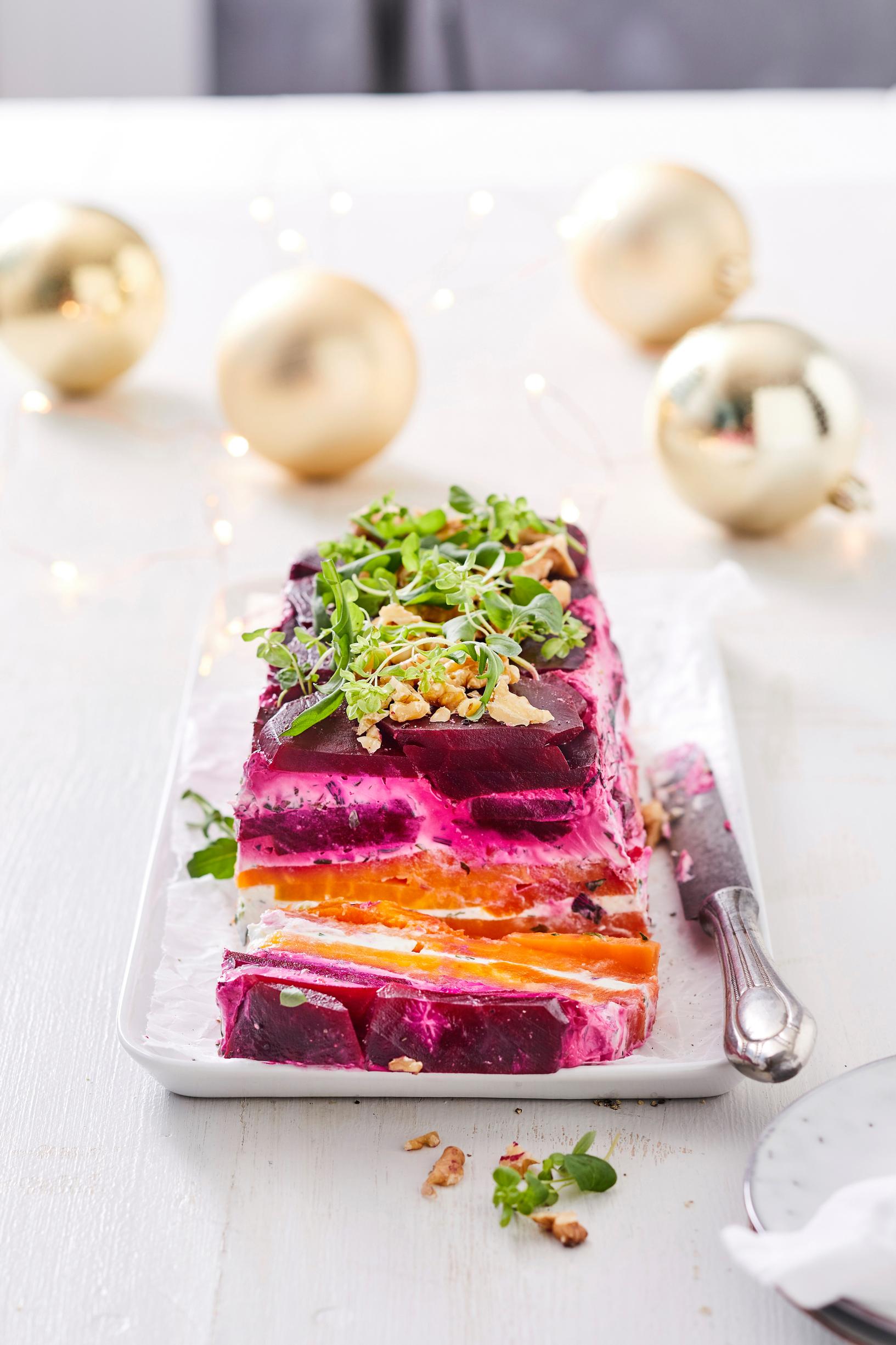 Kasvisterriini on joulupöydän väripilkku – kaunis ulkokuori kätkee sisäänsä pehmeää vuohenjuustoa, bataattia ja punajuurta