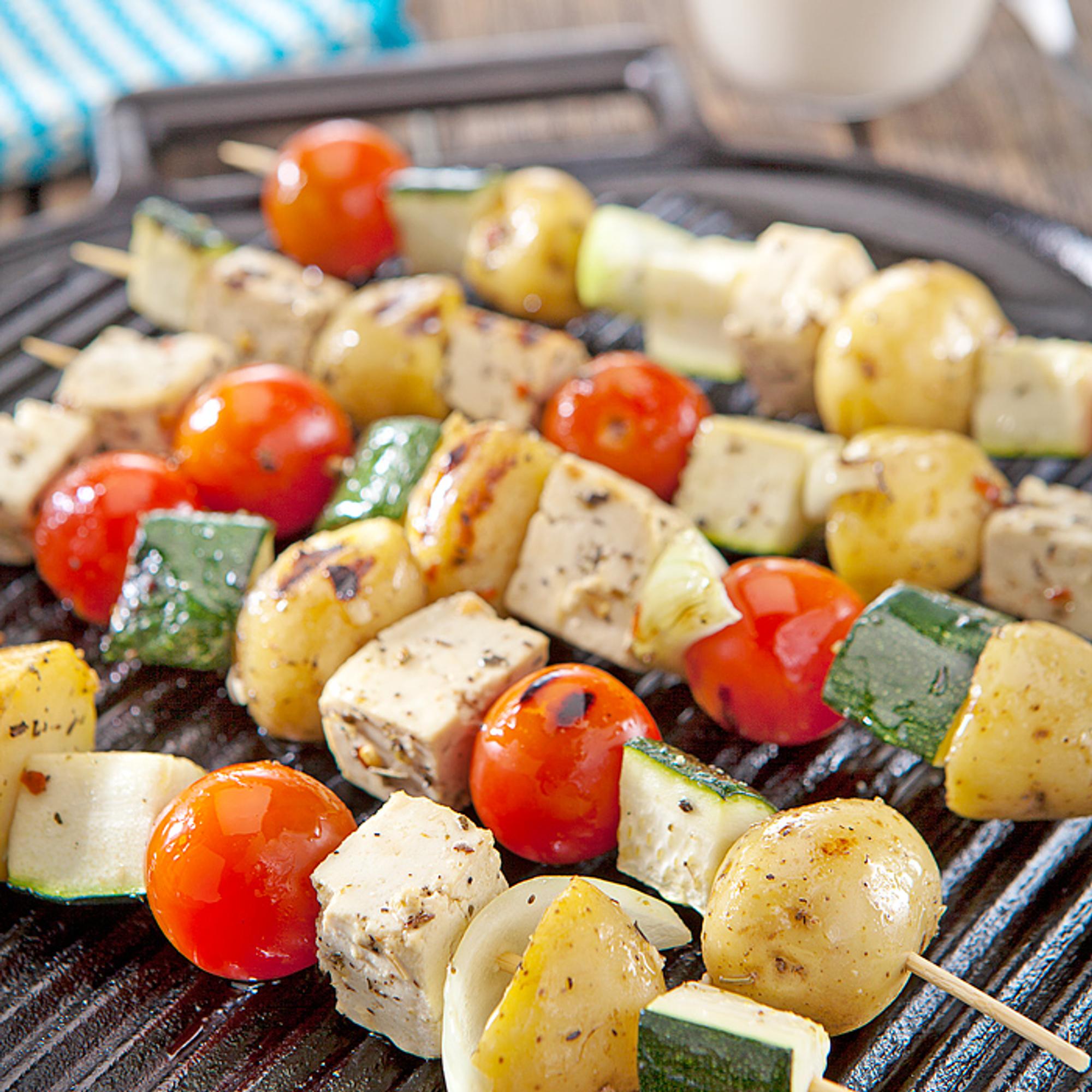 Työnnä liotettuihin varrastikkuihin vuorotellen tofupaloja, perunoita, kesäkurpitsoita, kirsikkatomaatteja ja sipulilohkoja. Sivele marinadilla ja grillaa kasvisvartaat käännellen.