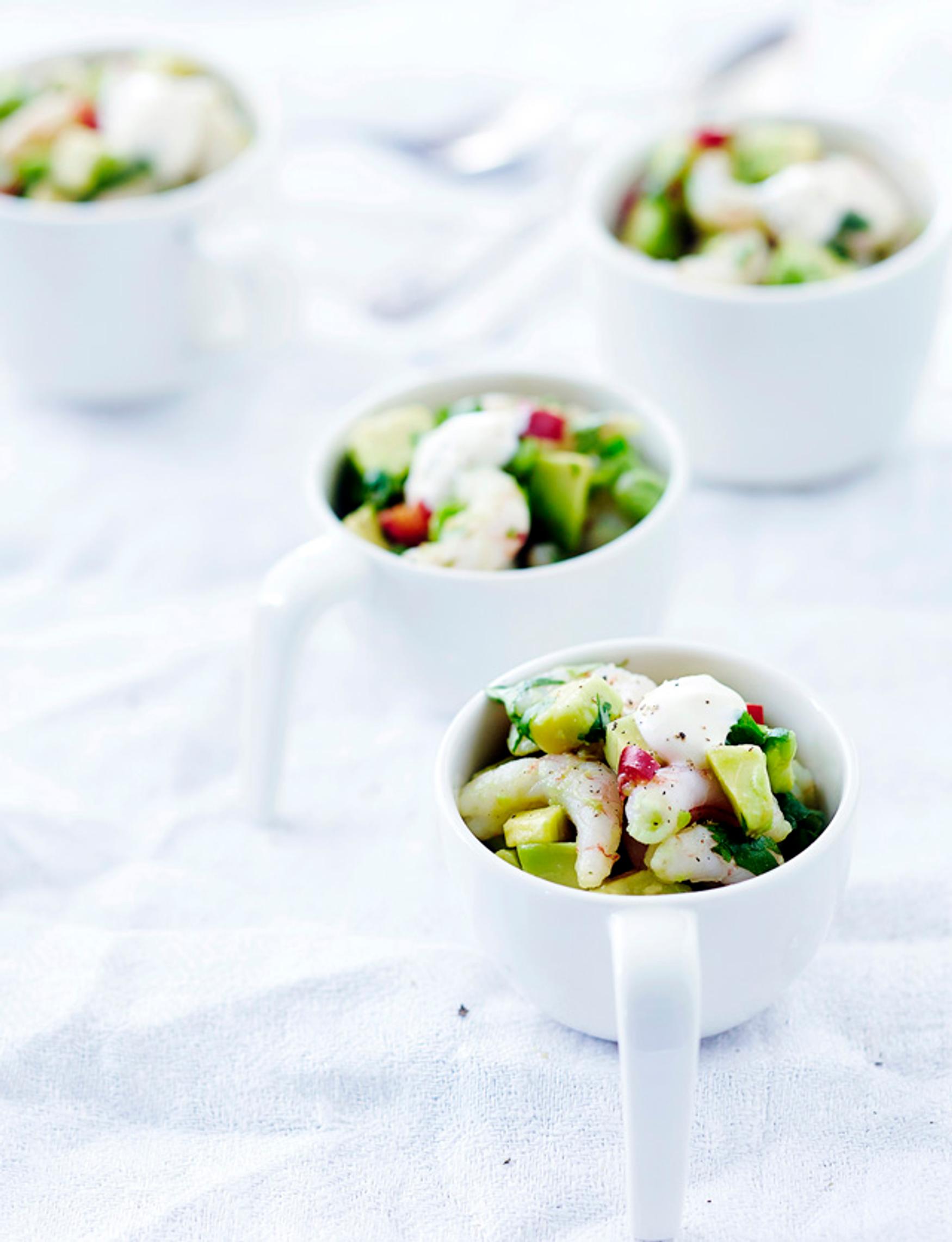 Katkarapu-avokadosalaatti maustetaan tuoreella korianterilla, chilillä ja limellä. Salaatin voi tarjota myös alkuruokana pienistä annoskupeista.