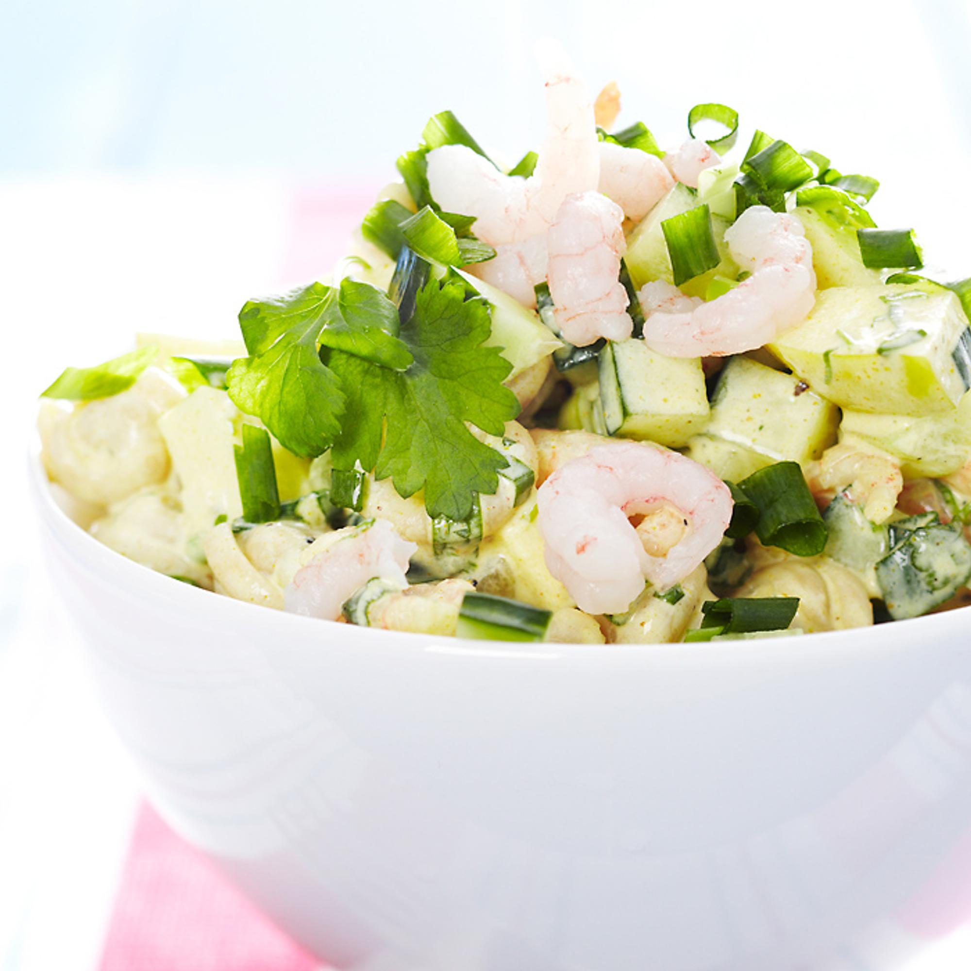 Kumoa katkarapu-pastasalaatti tarjoiluastiaan. Koristele katkarapusalaatti korianterinlehdillä ja kevätsipulilla.