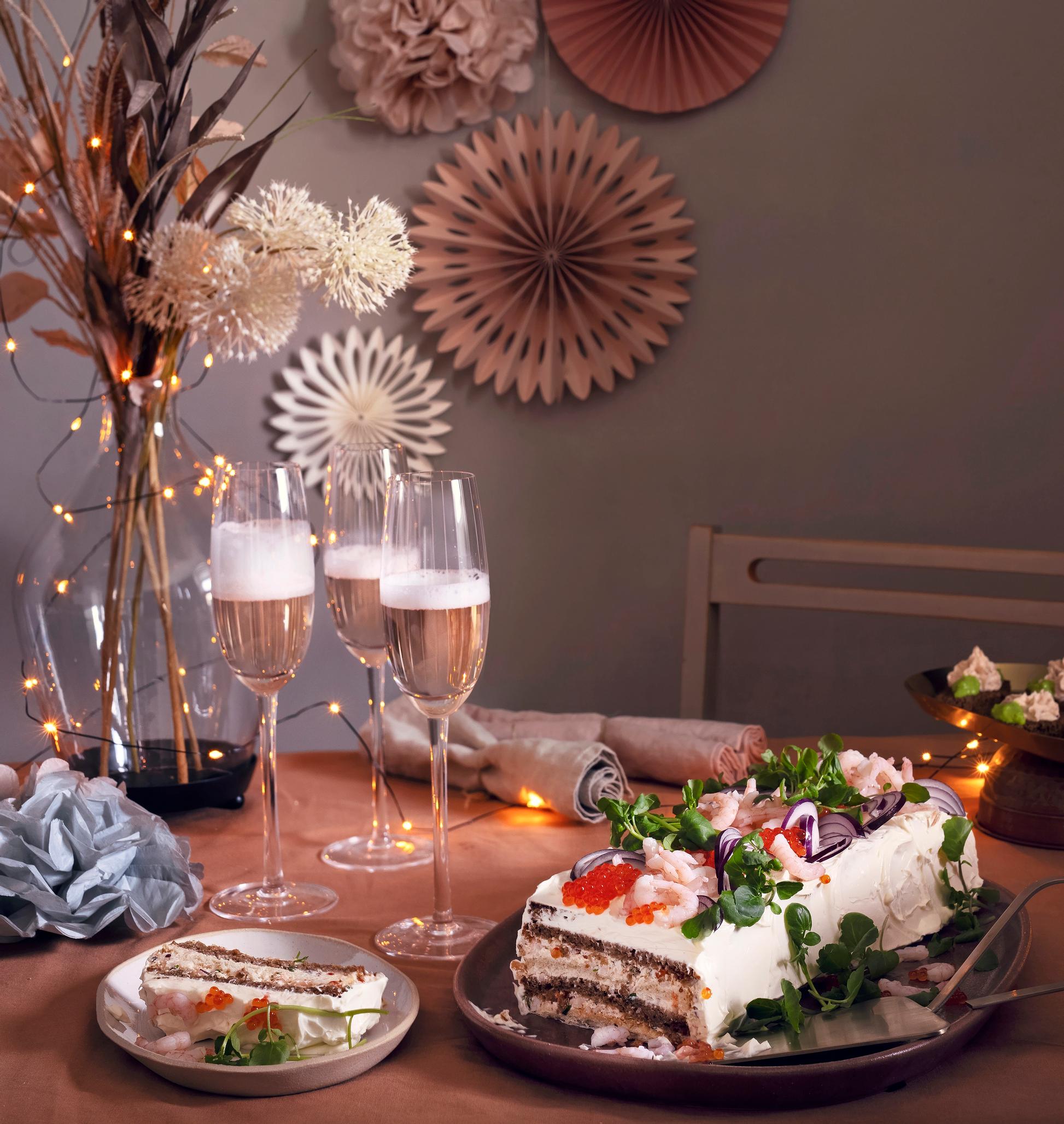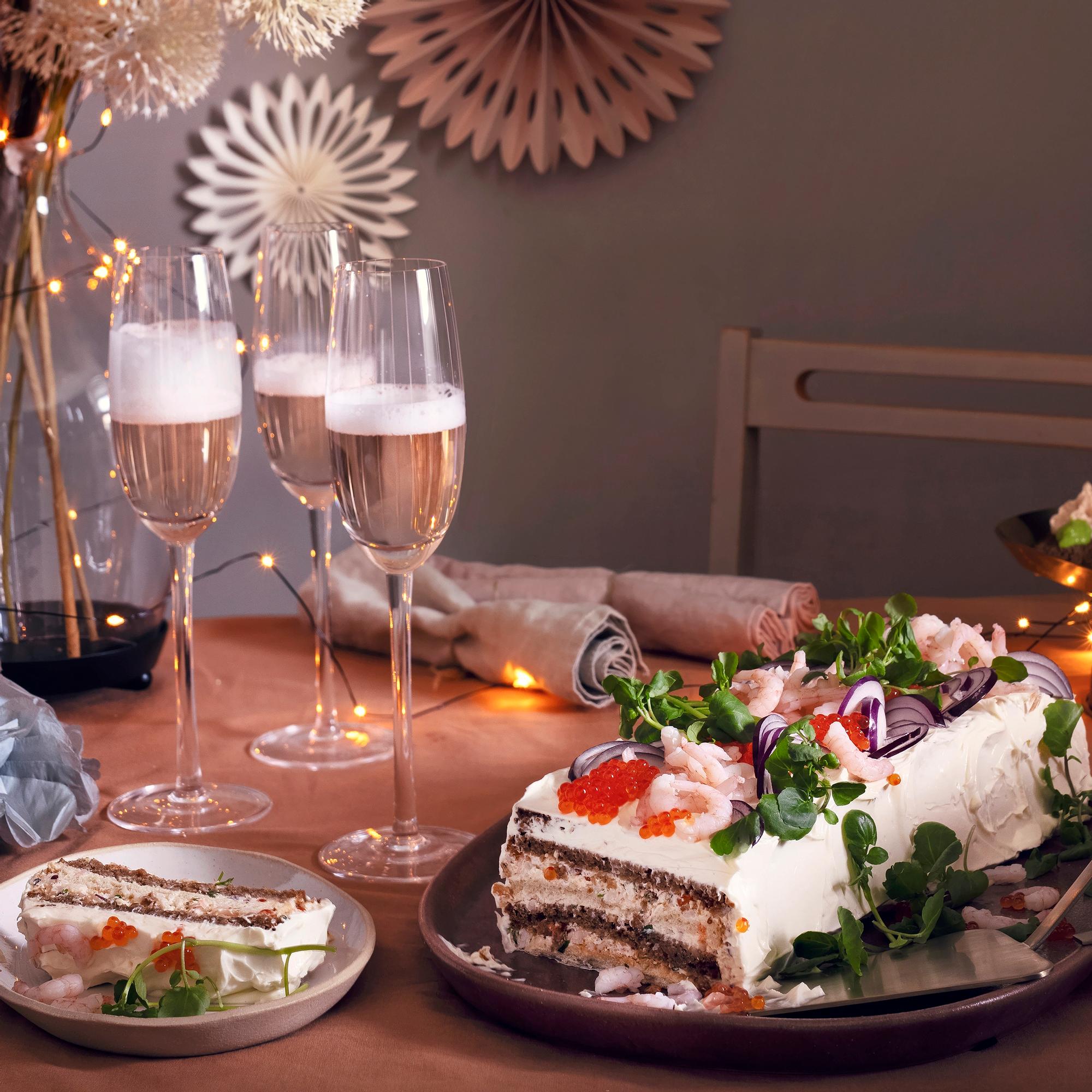 Vanha kunnon voileipäkakku toimii aina! Katkarapuvoileipäkakku tehdään toast skagenin makumaailmaan