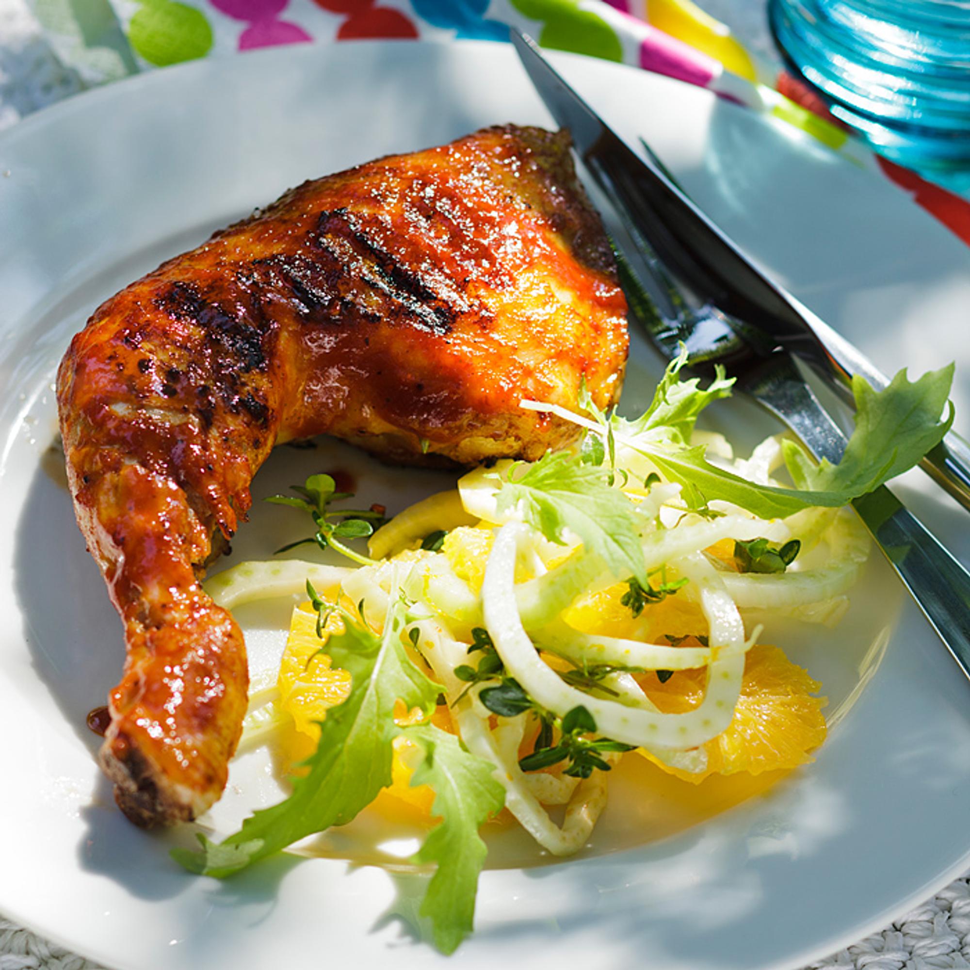 Tarjoa keitetyt ja grillatut broilerin koipireidet esimerkiksi appelsiini-fenkolisalaatin kanssa.