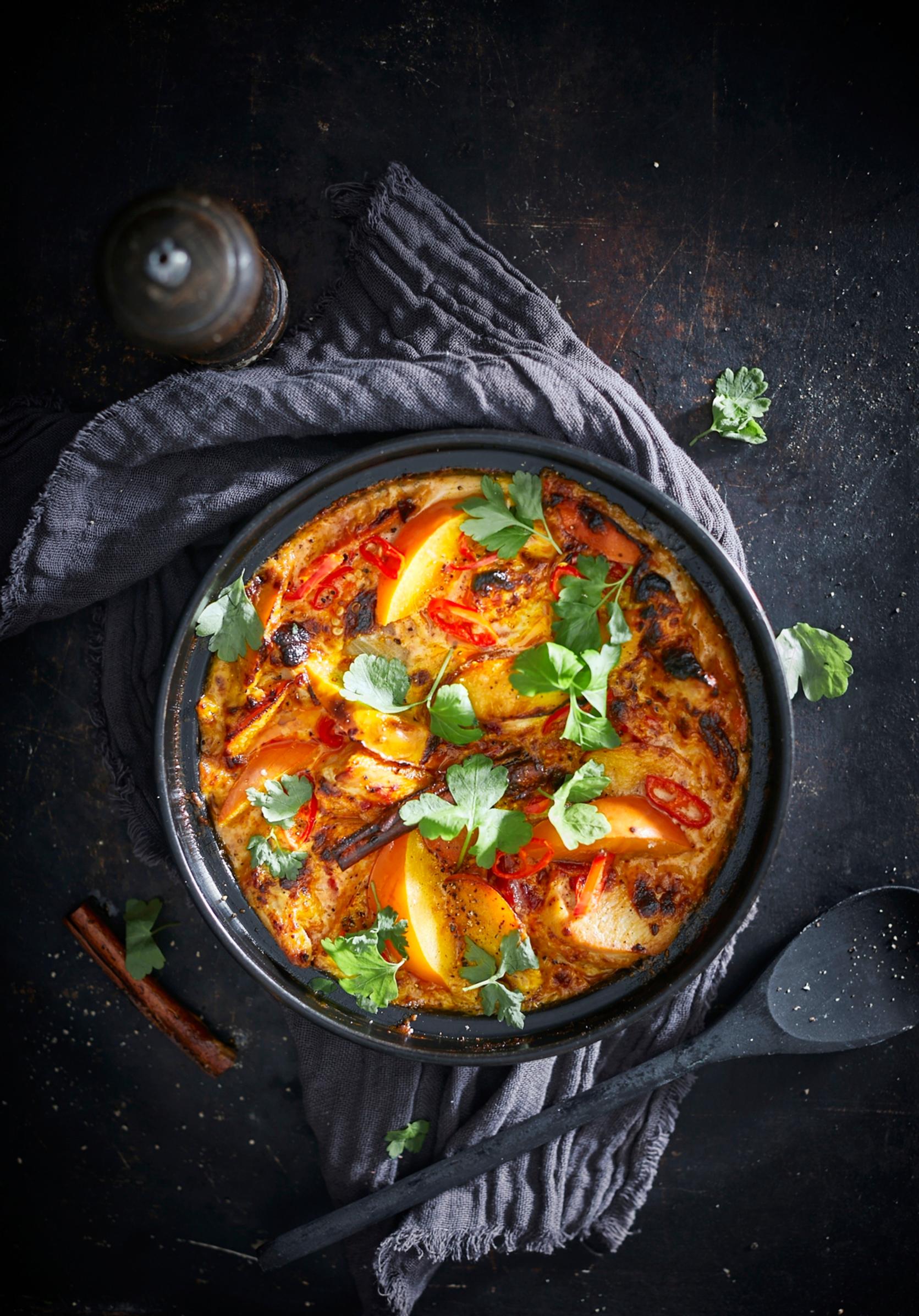 - Sekoita pataa kevyesti ja laita kansi päälle. Hauduta 175-asteisessa uunissa noin tunti. Viimeistele pata lehtipersiljalla. Tarjoa esimerkiksi keitetyn riisin kanssa.