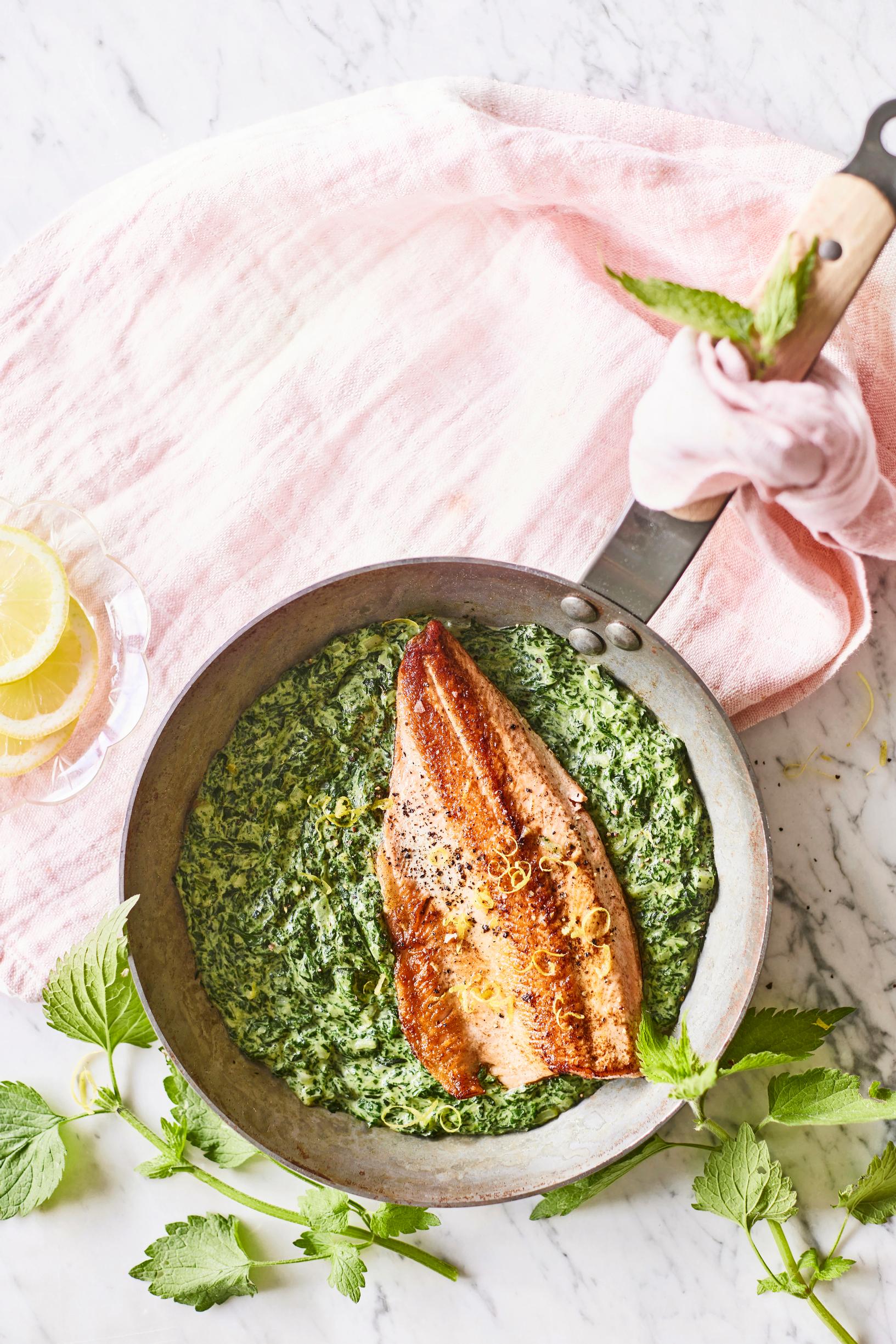 Pinaatin tyyliin kermaan muhennettu nokkonen on täydellinen lisuke paistetulle kalalle. Tarjoa kalan kanssa sitruunasiivuja tai -lohkoja. Kaveriksi sopivat keitetyt uuden sadon perunat.