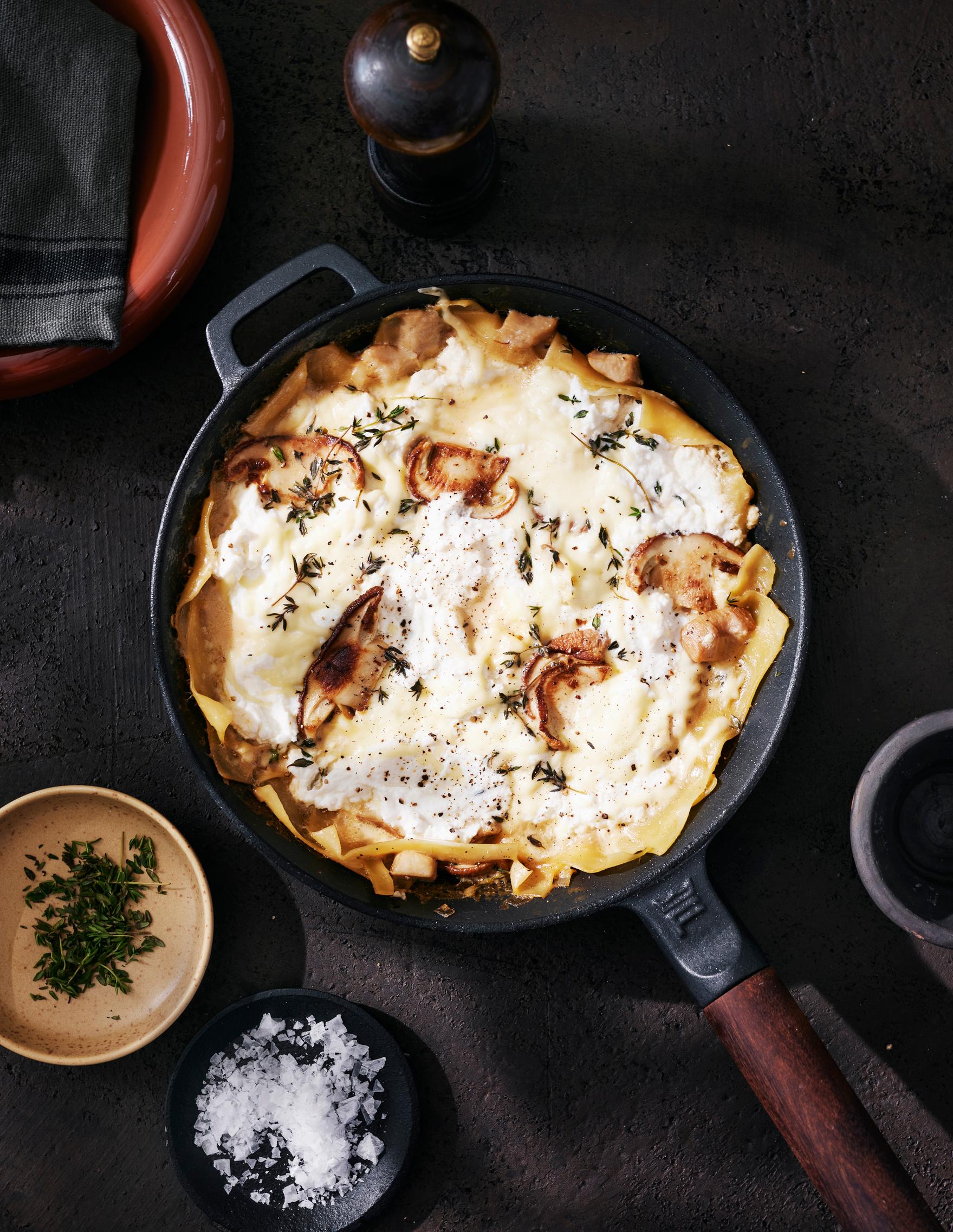 Kermainen pannulasagne syntyy syksyn sienistä – yhden pannun pikalasagne valmistuu puolessa tunnissa
