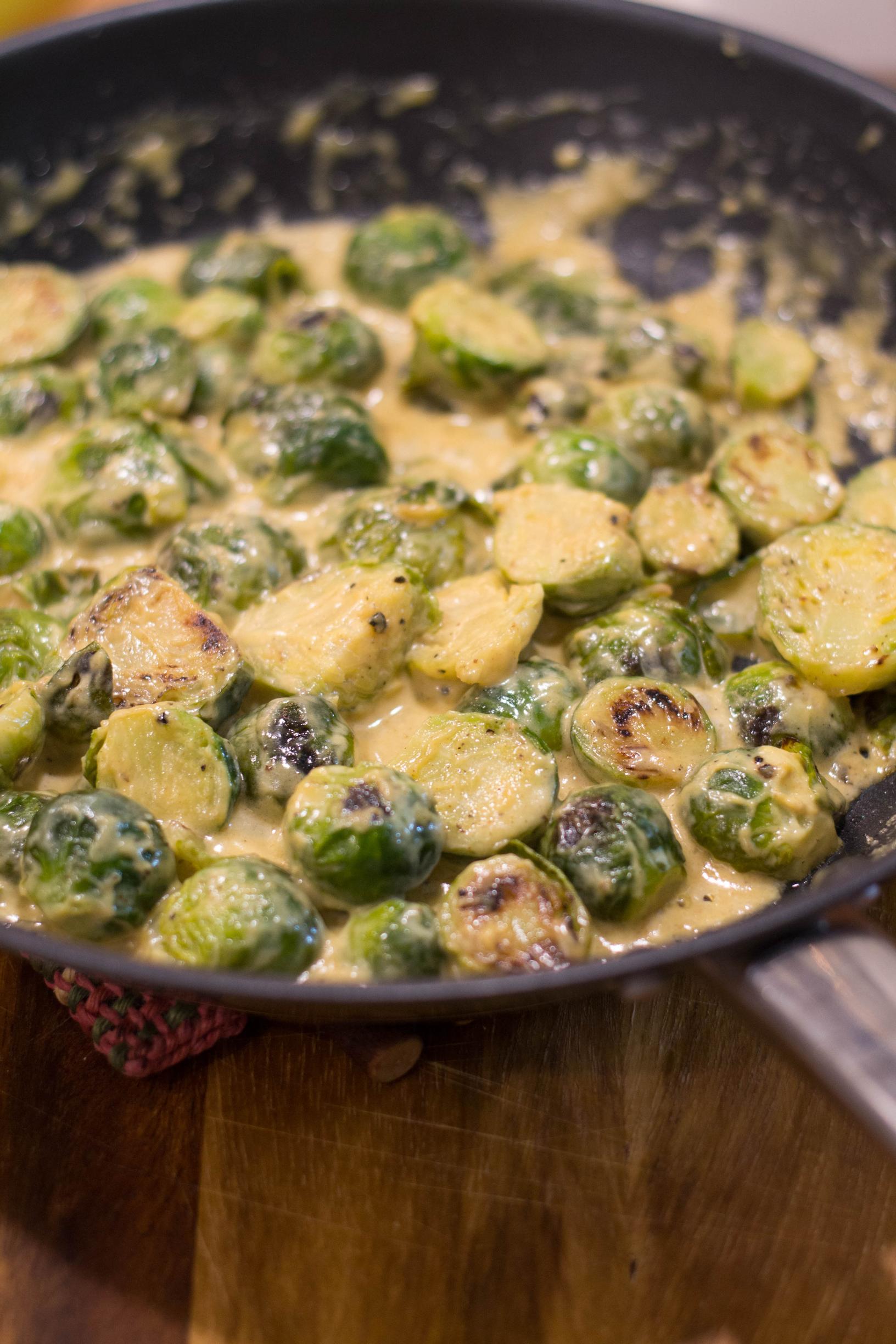 Lisää pannuun kerma ja Dijon sinappi. Anna ruusukaalien hautua kermassa kunnes kermakastike on paksuuntunut. Mausta suolalla ja pippurilla.
