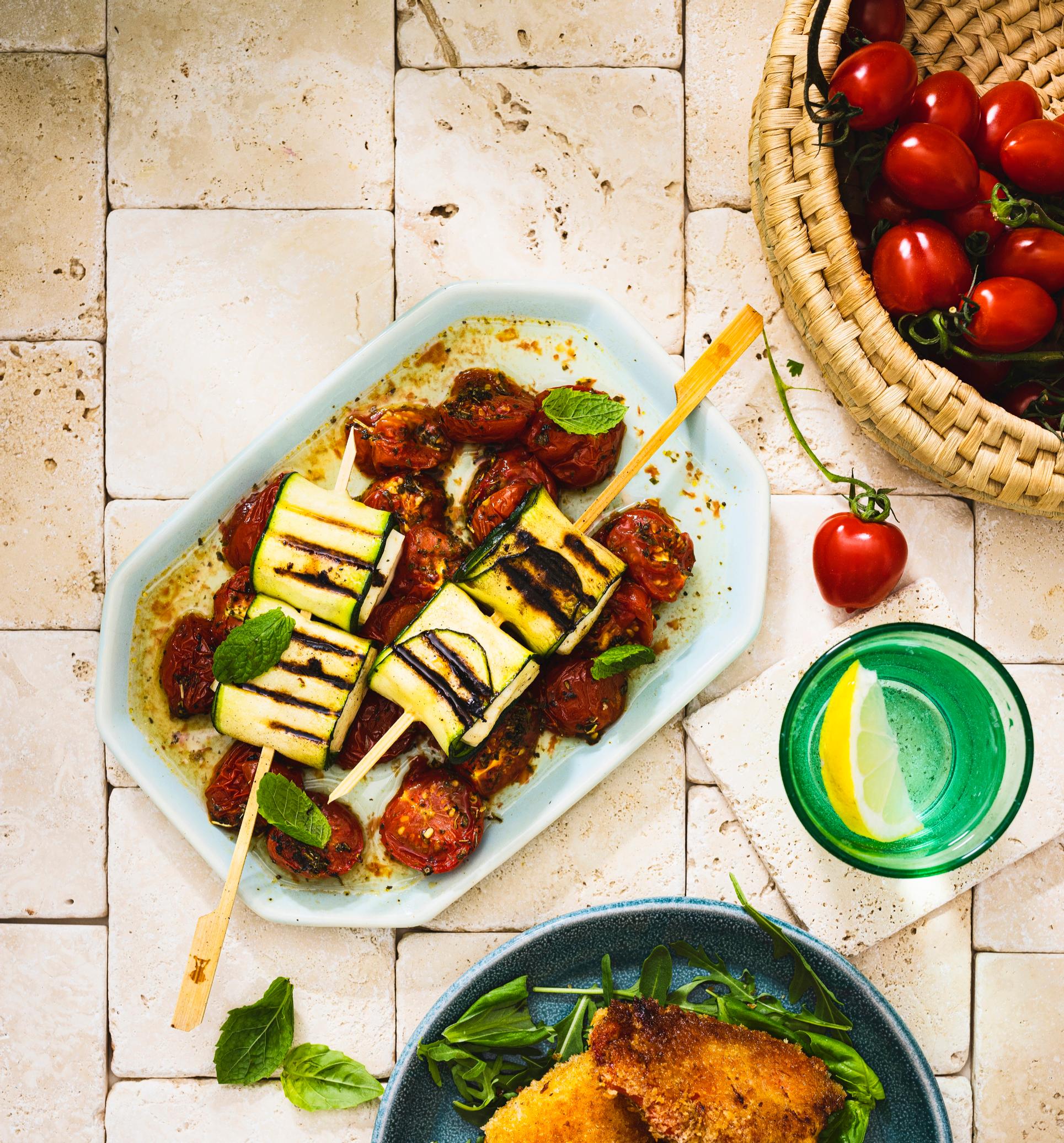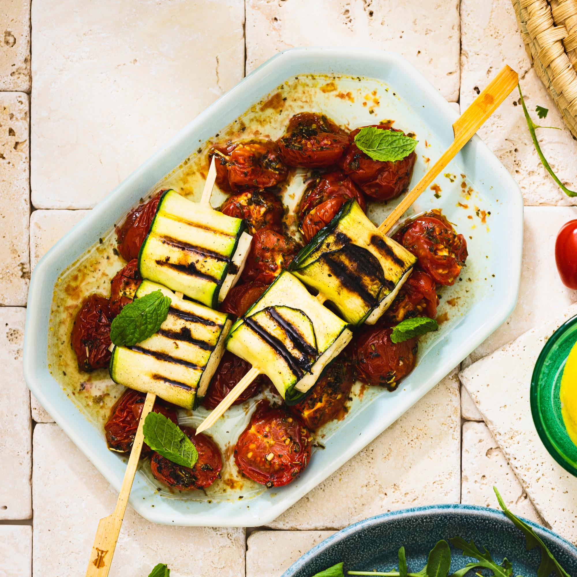 Kesäkurpitsa-halloumivartaat tarjoillaan mehukkaiden grillitomaattien kanssa – nappaa helppo ohje!