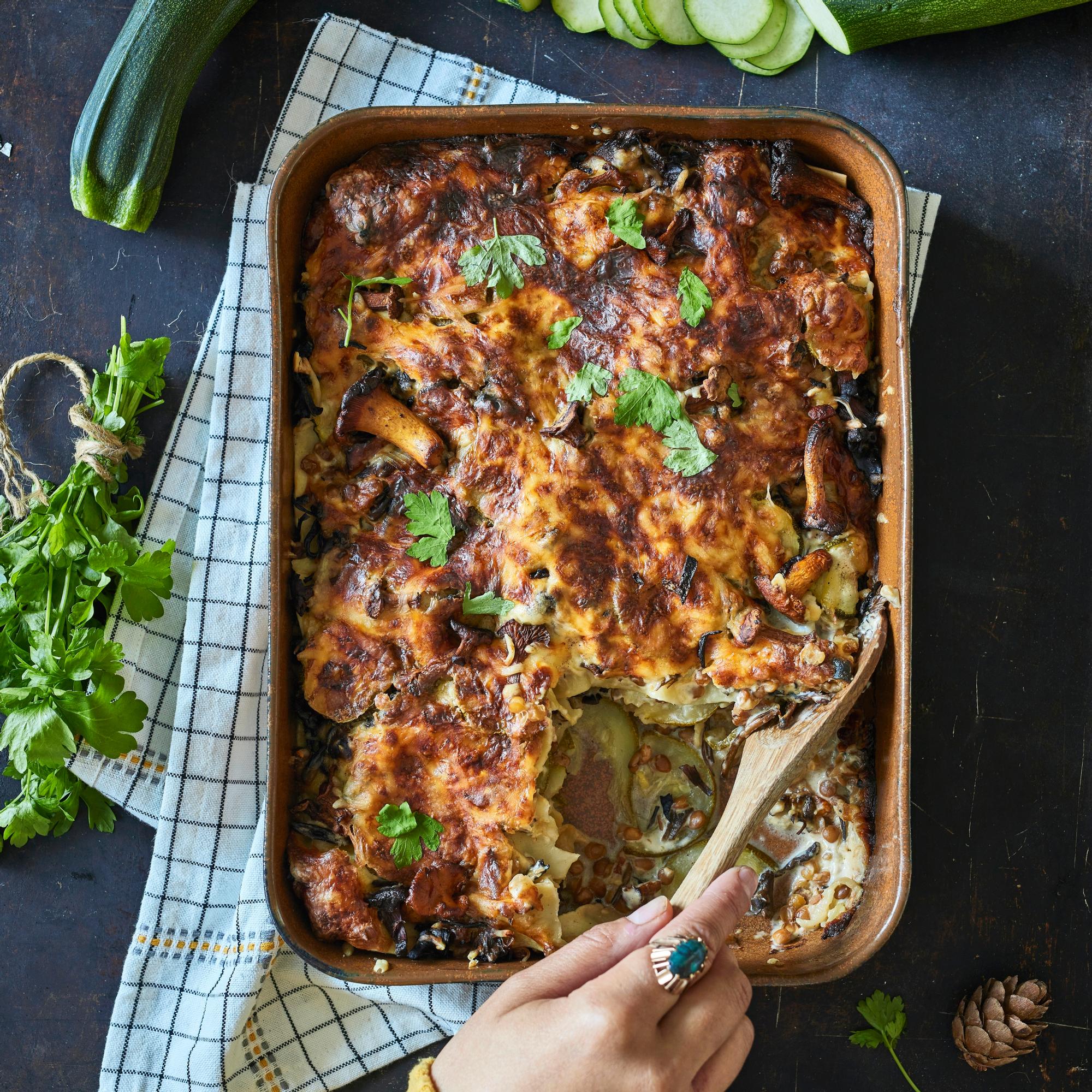 Kesäkurpitsa-kantarellilasagne – juustoinen uunipasta lämmittää vatsaa ja mieltä