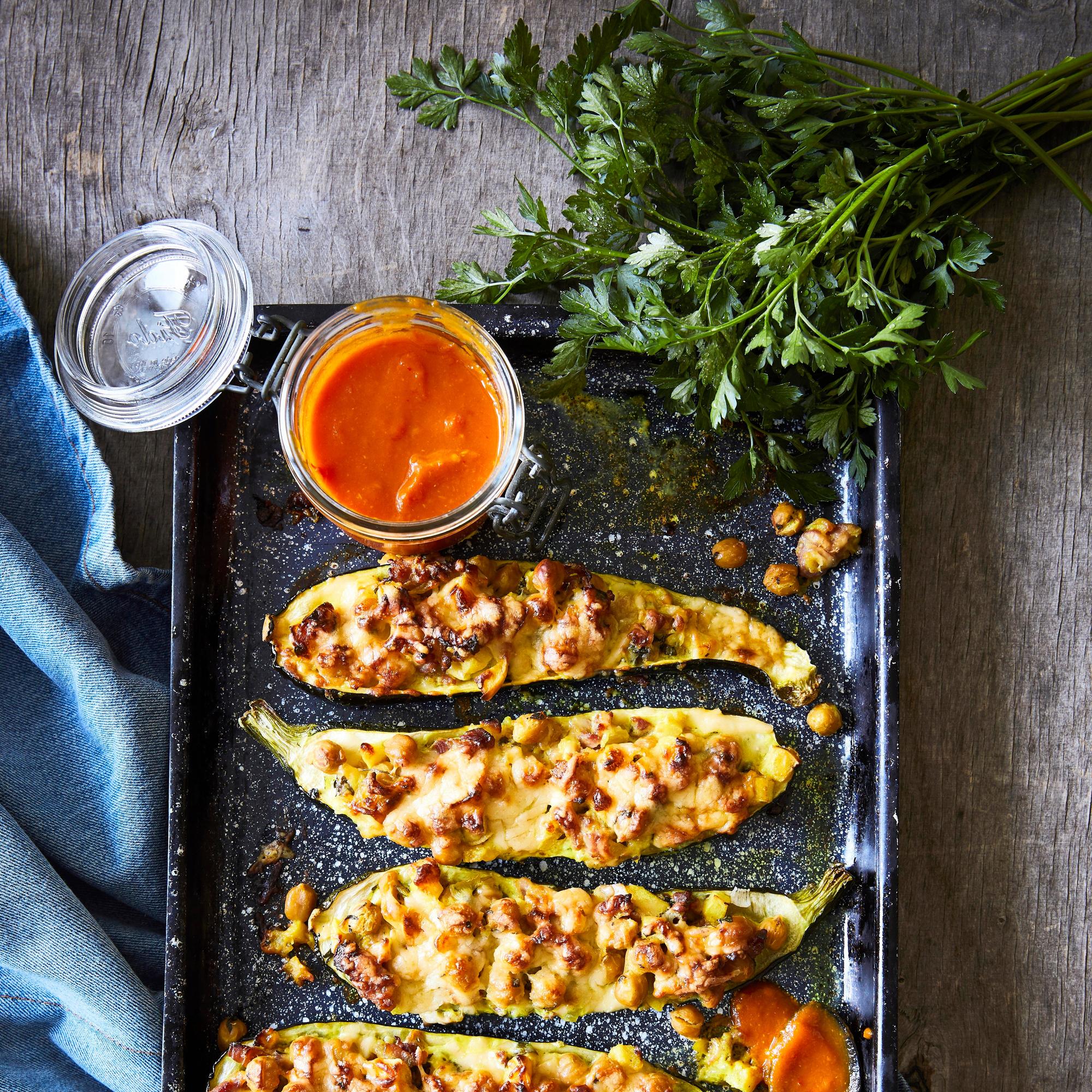 35 minKesäkurpitsaveneet kätkevät sisäänsä pekonista, omenista ja kikherneistä tehdyn täytteen, joka mehevöitetään purkillisella ranskankermaa. Cheddarjuustoraasteella kuorrutetut kesäkurpitsapuolikkaat saavat pikantin lisän vaikka itse tehtystä tomaattipikkelssistä.