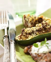 - Halkaise kesäkurpitsat pitkittäin ja koverra sisus lusikalla kulhoon. Voitele kurpitsat öljyllä ja esikypsennä 200 asteessa 10 minuuttia.