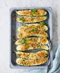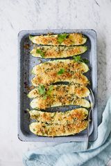 - Siirrä pannu syrjään liedeltä. Valuta kikherneet liemestään ja lisää pannulle ranskankerman kanssa. Mausta suolalla ja hienonnetulla lehtipersiljalla. Lusikoi täyte kesäkurpitsanpuolikkaisiin ja ripottele juustoraaste täytteen päälle. Kypsennä 200 asteessa 20–25 minuuttia.