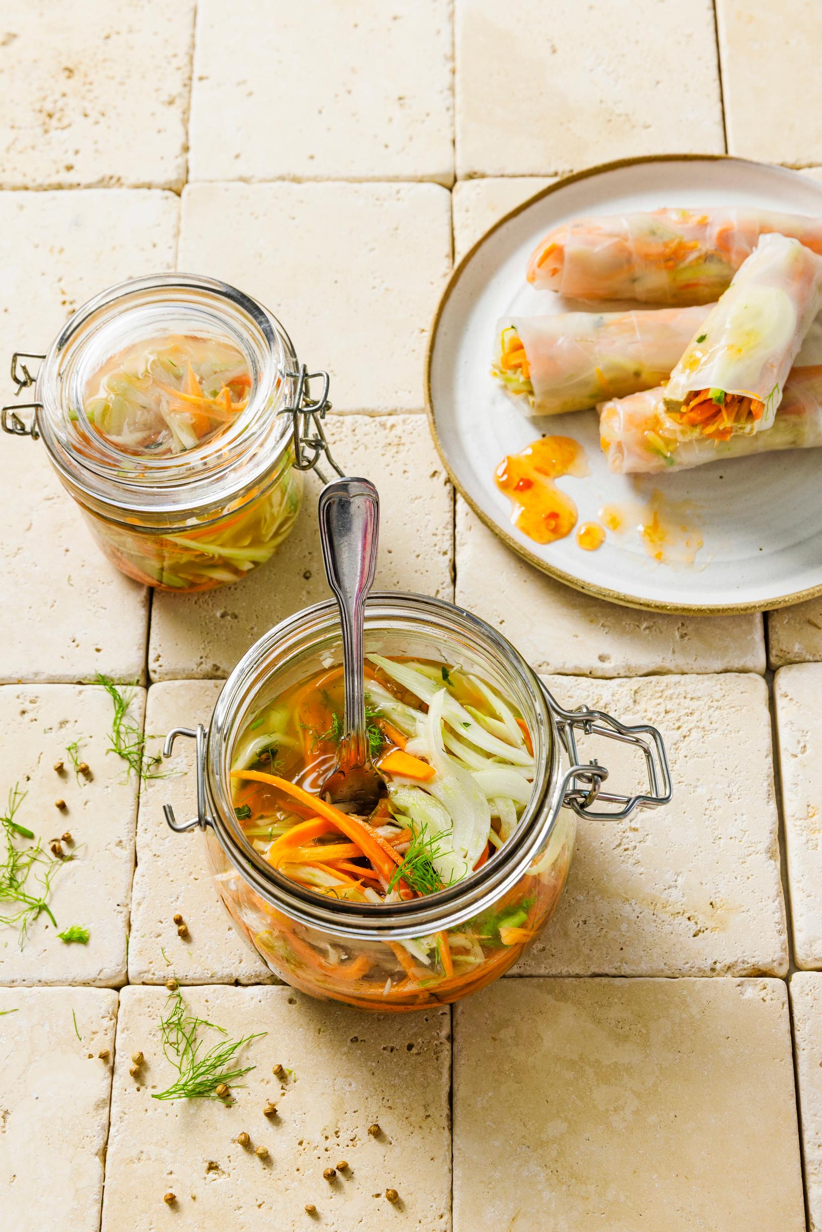 - Halkaise fenkoli, huuhtele ja poista kanta, leikkaa ohuiksi suikaleiksi. Kuori porkkanat ja leikkaa esimerkiksi mandoliinilla raasteeksi. Nosta kasvikset purkkiin. Kaada päälle liemi. Hölskyttele. Kun liemi tuntuu jäähtyneeltä, pikkelikasvikset ovat syötäviä.