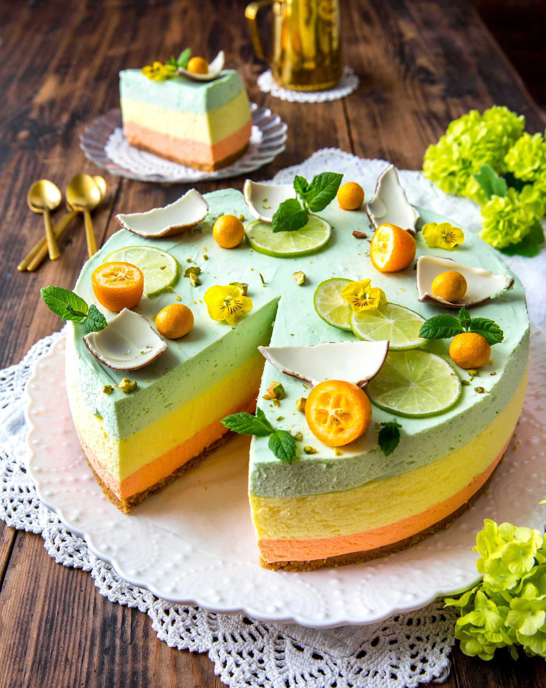 - Laita limetäytteen liivatelehdet likoamaan kylmään veteen. Raasta kahden limen kuori. Vatkaa kerma vaahdoksi. Sekoita vaahdotuksen aikana joukkoon vihreää väriä. Yhdistä rahka, tuorejuusto, sokeri ja kuoriraaste. Purista limemehu. Kuumenna mehu kiehuvaksi ja sulata joukkoon liotetut liivatteet. Sekoita liivatemehu rahkaseoksen joukkoon. Yhdistä kermavaahdon kanssa. Levitä täyte vuokaan ja anna kakun jähmettyä vielä noin 3 tuntia.