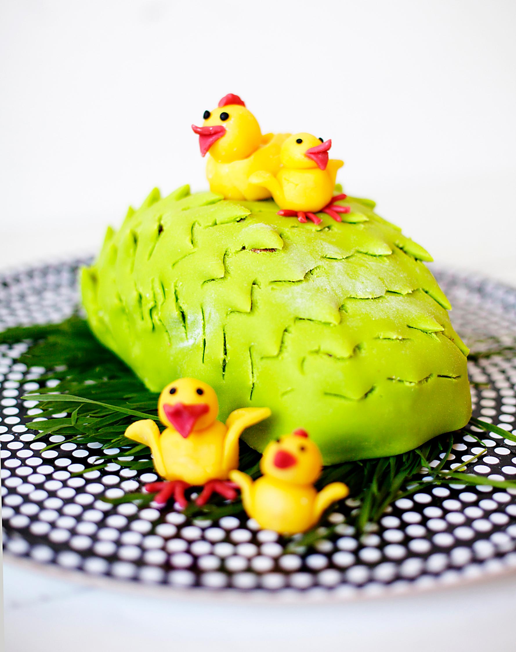 15. Muotoile kakkuun halutessasi koristeeksi marsipaanitipuja. Kakku säilyy hyvin jääkaapissa seuraavaan päivään. Ota kakku huoneenlämpöön noin 30 minuuttia ennen tarjoilua, jotta sitä on helpompi leikata.