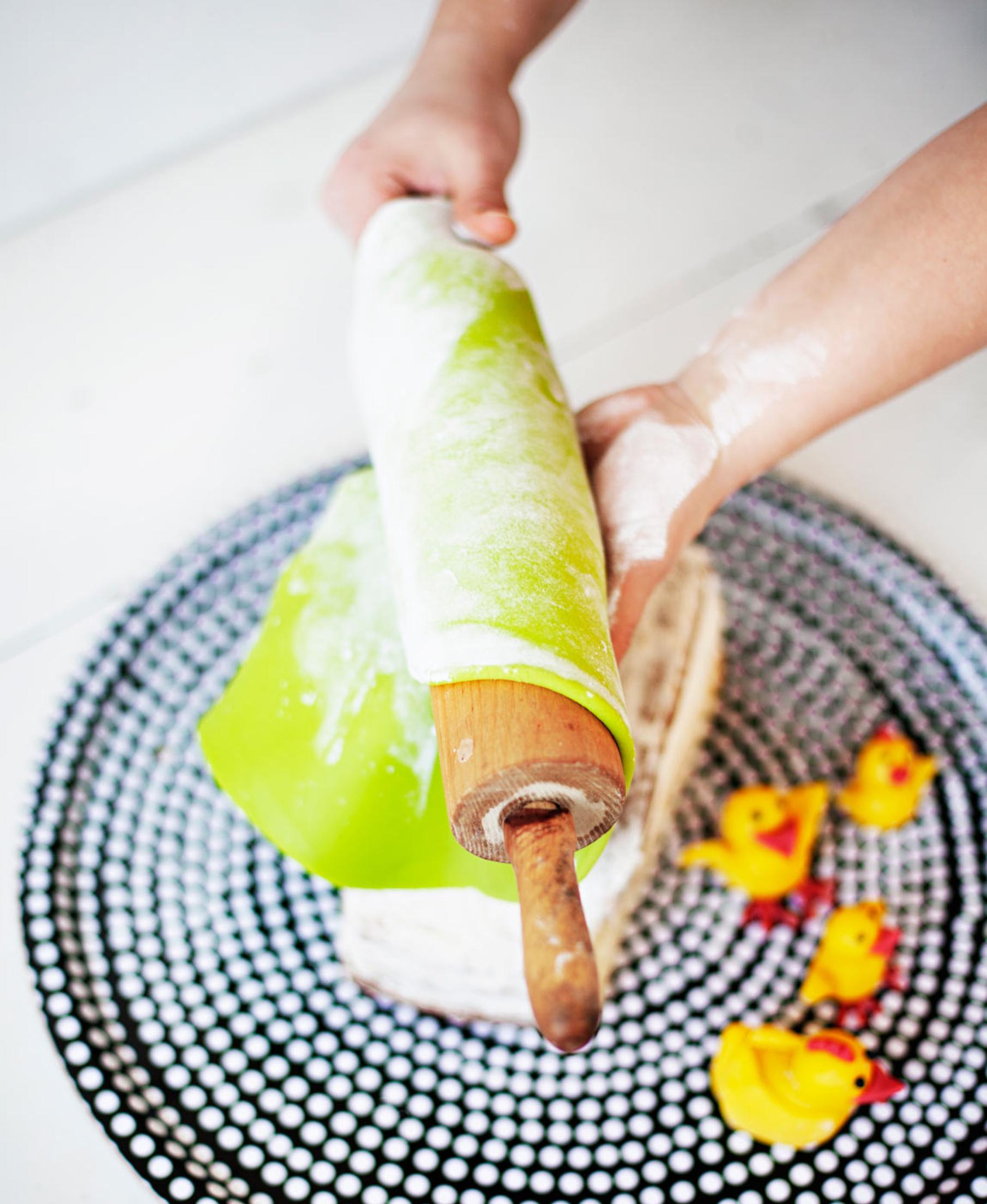 13. Ripottele työpöydälle tomusokeria. Se estää marsipaania tarttumasta. Muotoile marsipaanipötköt yhdeksi tasaiseksi palloksi ja kauli se noin 3–4 milliä paksuksi levyksi.