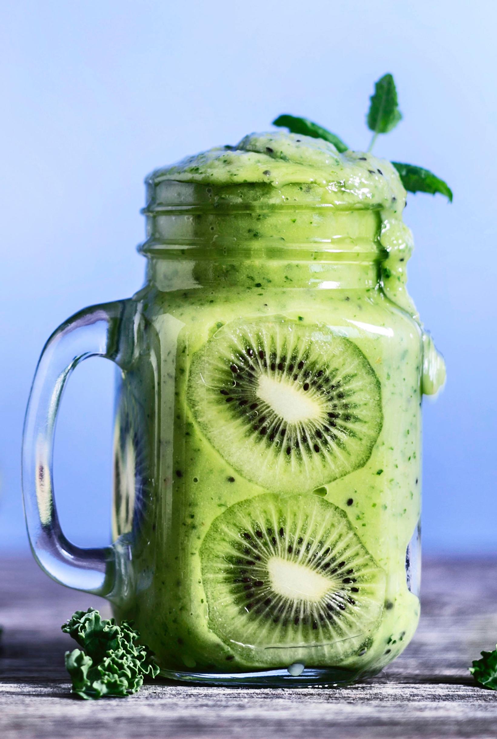 Vihersmoothie maistuu miltei kermaiselta, kun lisäät siihen avokadoa. Koristele smoothielasit ohuilla kiiviviipaleilla. Ne pysyvät hyvin kiinni lasin seinämässä.