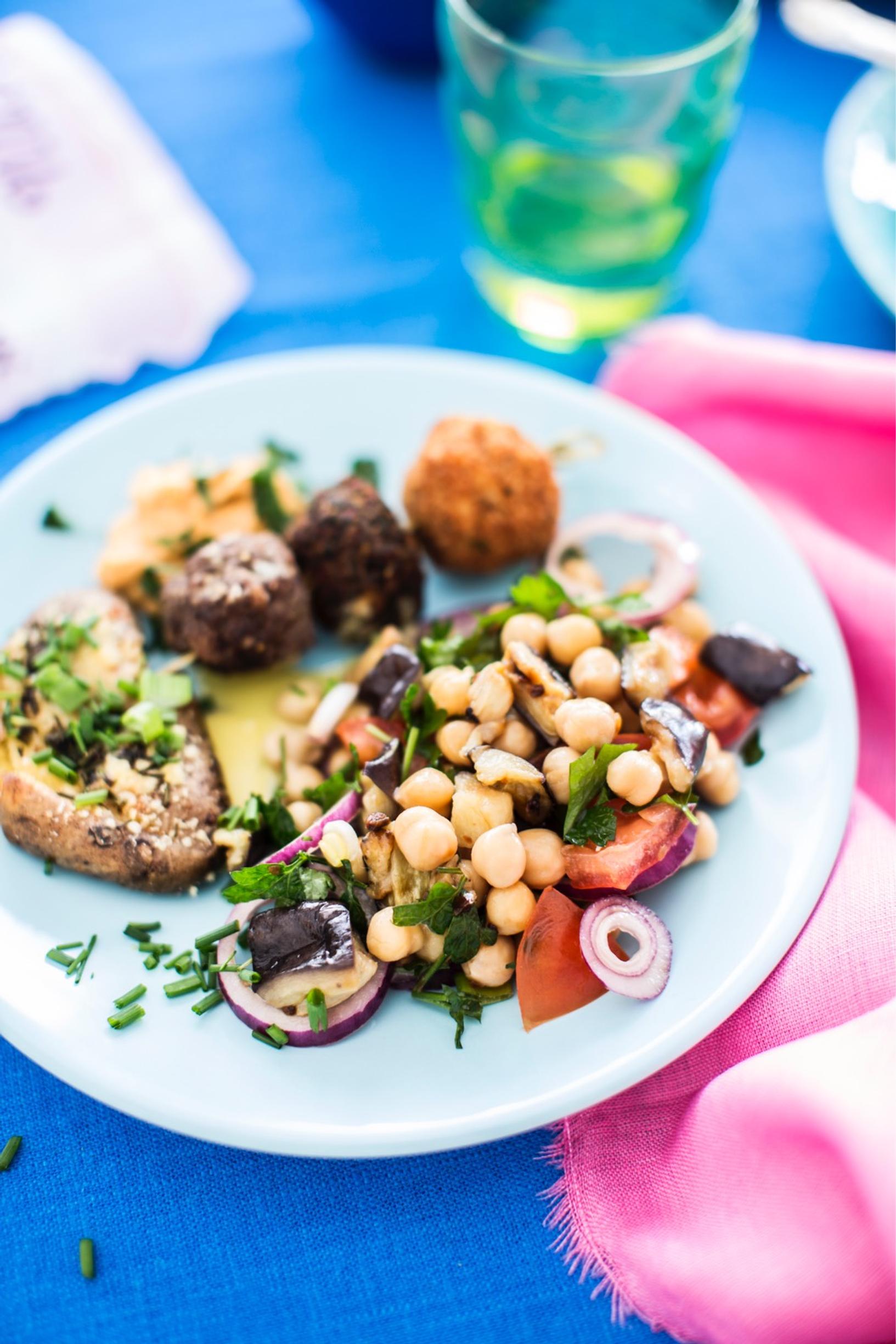 Valuta sipulit marinadista. Yhdistä kaikki kasvikset kulhossa ja kumoa tarjoilukulhoon. Purista kikherne-munakoisosalaatin päälle lopuksi päälle sitruunamehua.