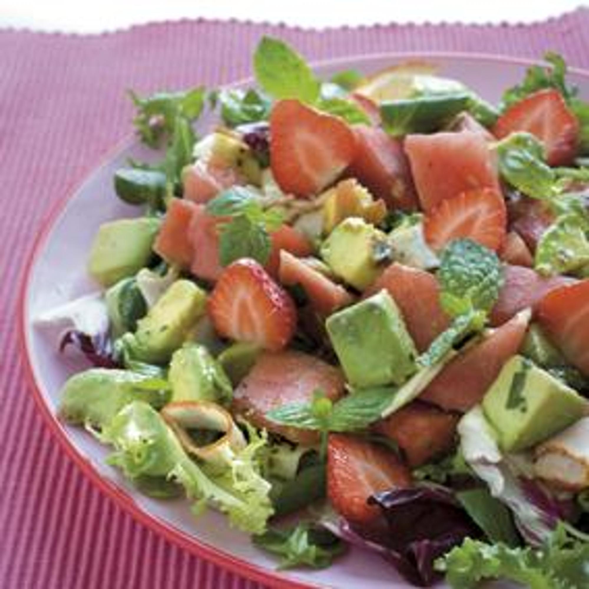 5. Asettele salaattisekoitus tarjoiluastiaan, niiden päälle vesimeloni, avokado ja kinkku. Valuta melonin mehu salaattiin. Koristele lopuksi mansikoilla.