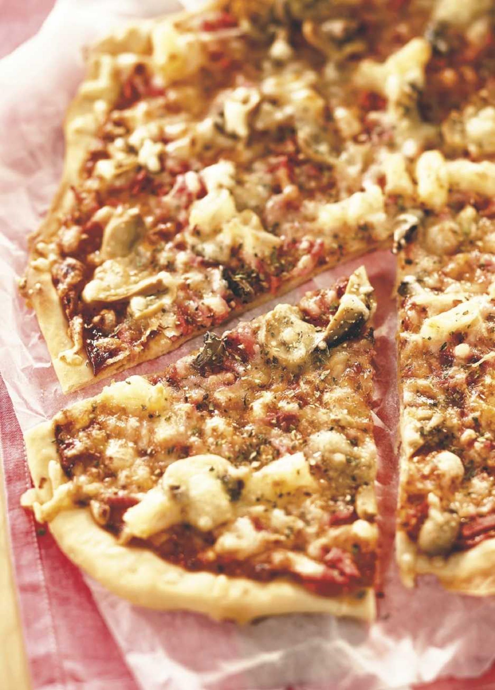 Kuumenna pizzataikinan vesi noin 42-asteiseksi. Liuota hiiva ja suola veteen. Lisää jauhot ja alusta taikina. Lisää öljy ja vaivaa vielä hetki. Kohota noin 20 minuuttia.
