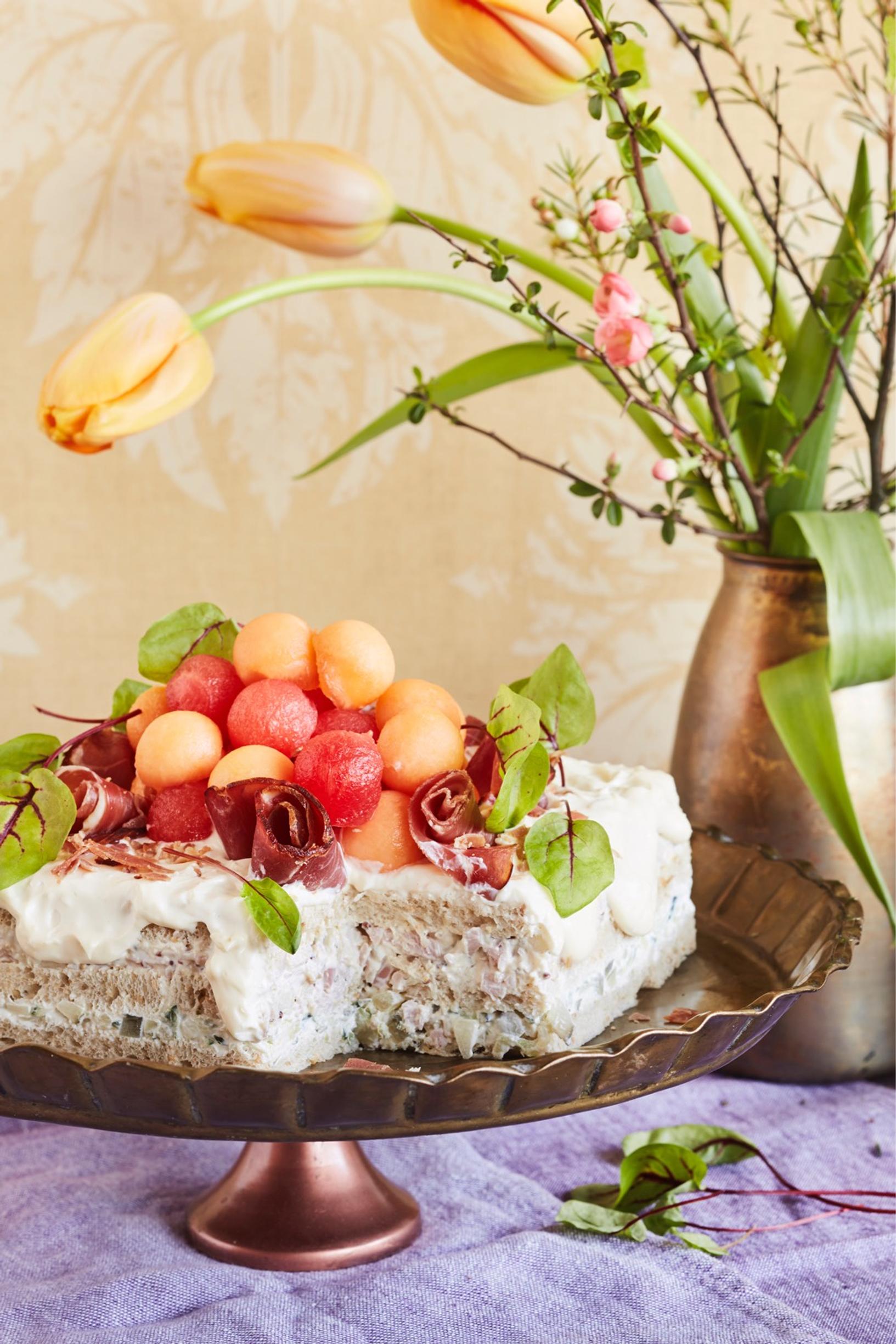 Levitä juusto kinkkukakun pinnalle. Koristele kakku melonipaloilla ja kinkkuruusukkeilla.