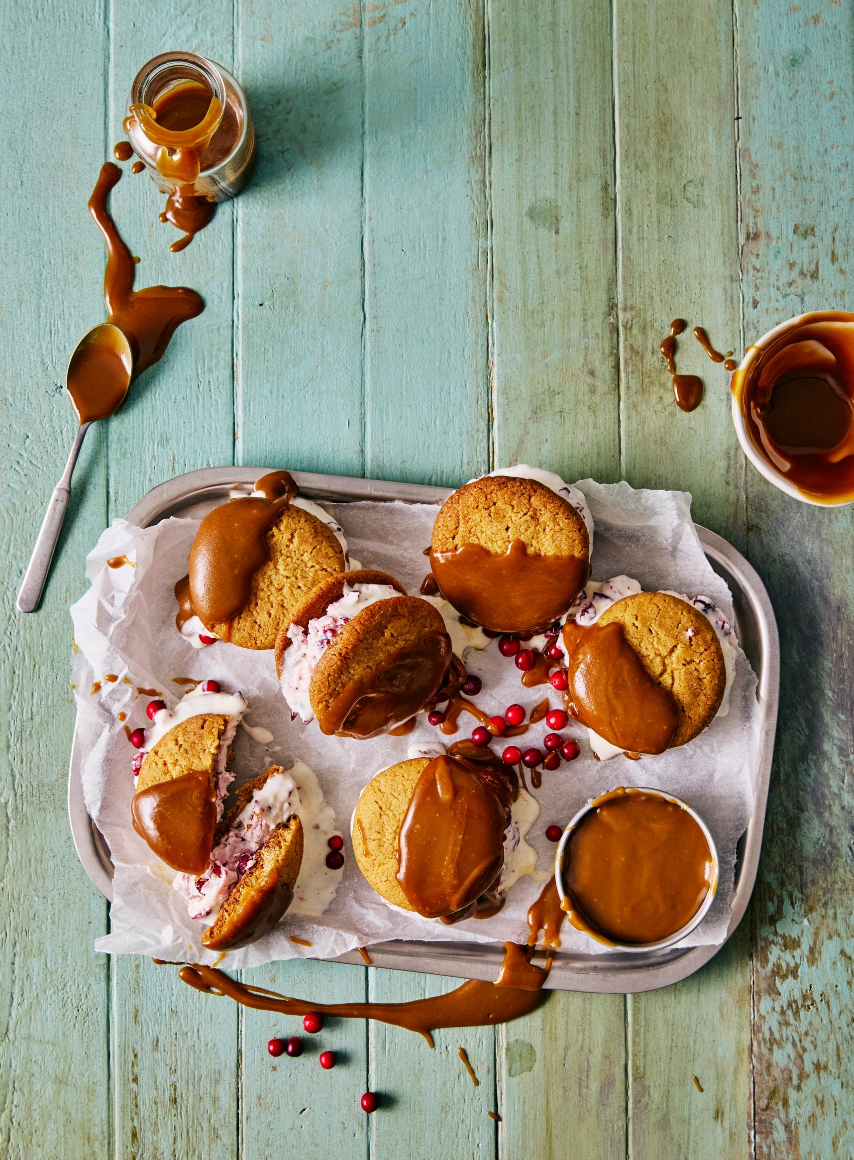 - Ota keksit pakastimesta ja valuta niiden päälle kinuskia. Tarjoa heti tai siirrä takaisin pakastimeen.