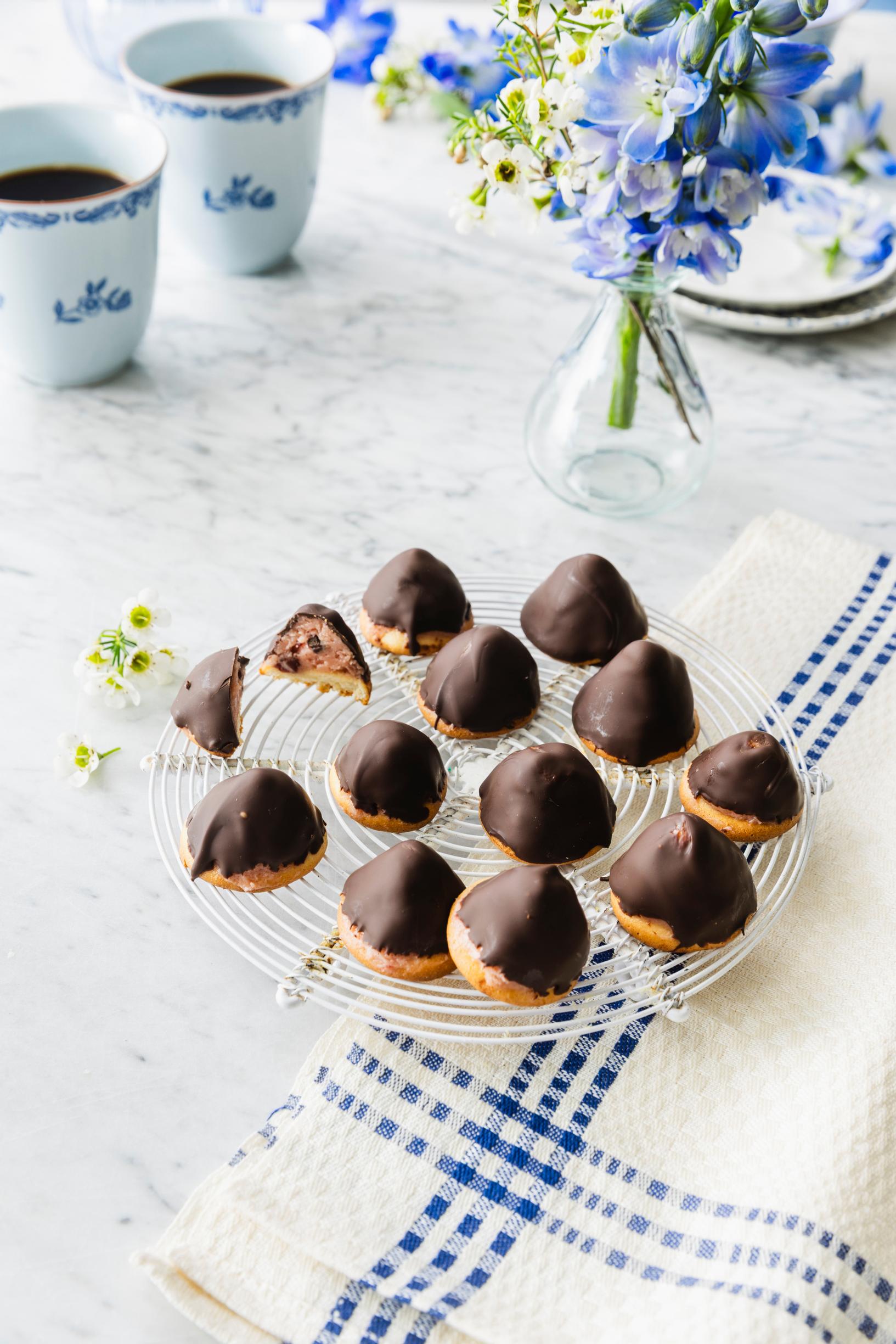 - Valmista täyte. Vatkaa voi, siivilöity tomusokeri, keltuainen ja marmeladi tasaiseksi massaksi. Levitä massa veitsen tai lastan avulla pohjille kartion muotoisiksi keoiksi. Pane leivonnaiset vadille ja nosta jääkaappiin tunniksi.