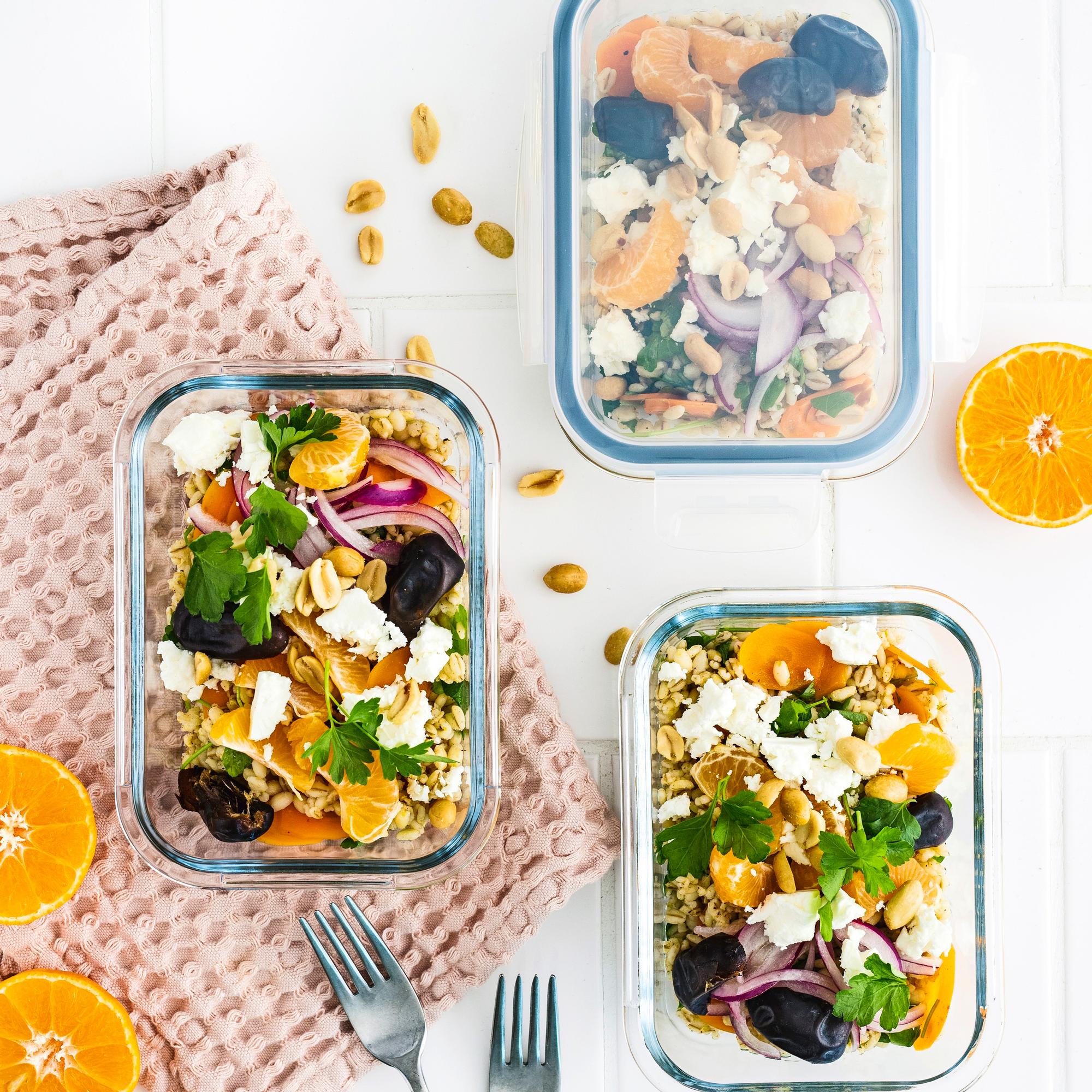 - Kokoa salaatti halutessasi annosrasioihin lounasevääksi: lusikoi ohraa rasiaan. Lisää sipulit kastikkeineen sekä porkkanat ja taatelit. Murustele feta ja rouhi pähkinät päälle.