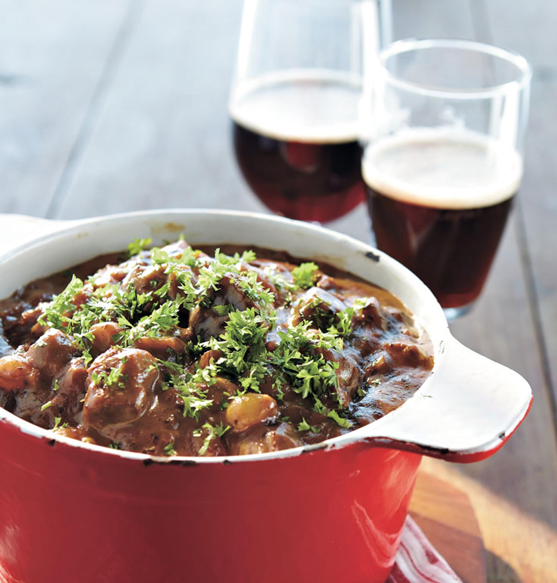 Kaada lihat marinadeineen pataan tai uuninkestävään vuokaan. Kuori sipulit. Lisää ne isoina lohkoina mukaan. Kaada joukkoon pullollinen olutta ja sekoita. Kypsennä noin 3 tuntia 150-asteisessa uunissa tai hellalla hauduttaen.