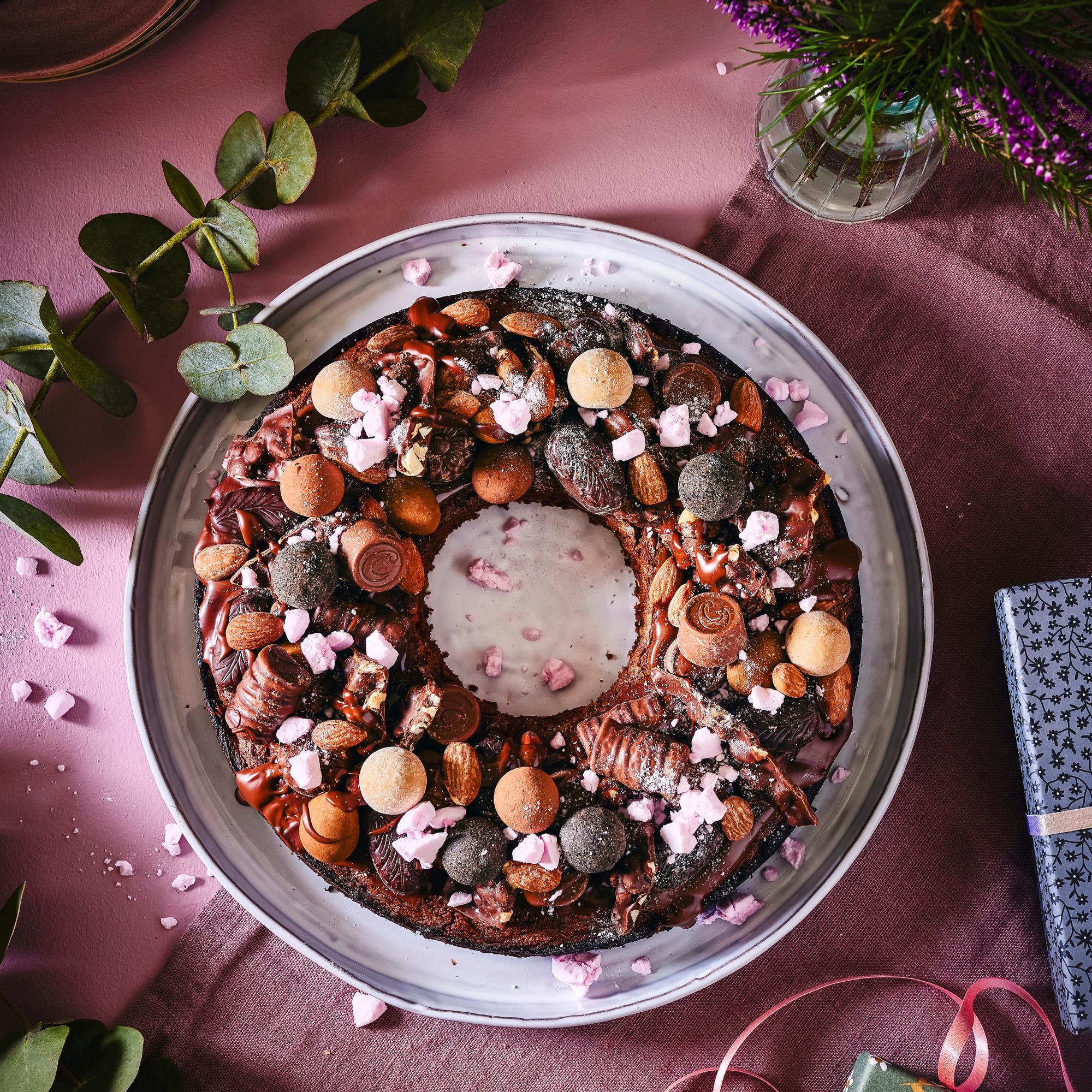 Koristele kranssin muotoon leivottu brownie juhlavaksi konvehdeilla ja muilla joulumakeisilla.