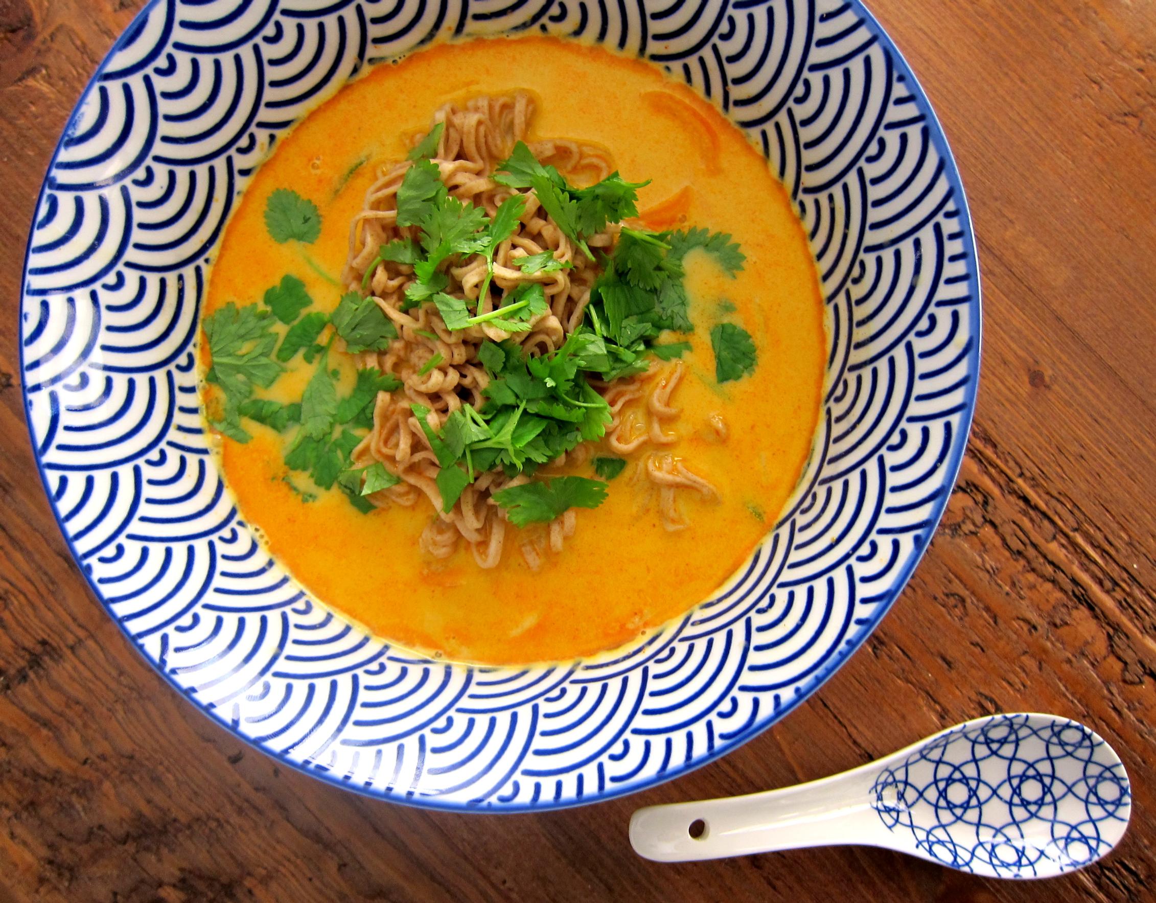 Nostele keittokauhalla keittoa porkkanoiden ja kesäkurpitsojen kera syville lautasille, lisää päälle nuudelit ja koristele yrteillä.