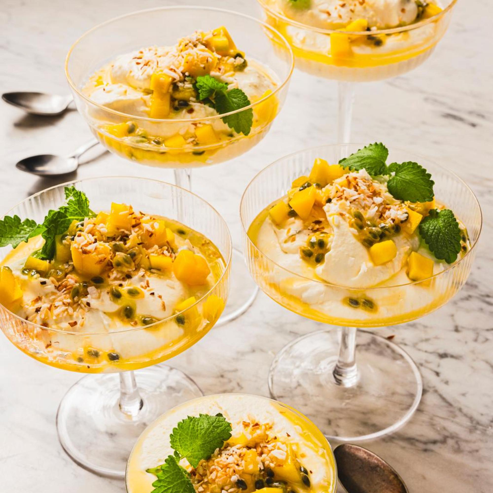 Mikä täydellinen jälkiruoka! Silkkinen kookosmousse kruunataan passio-mangohedelmäsalaatilla