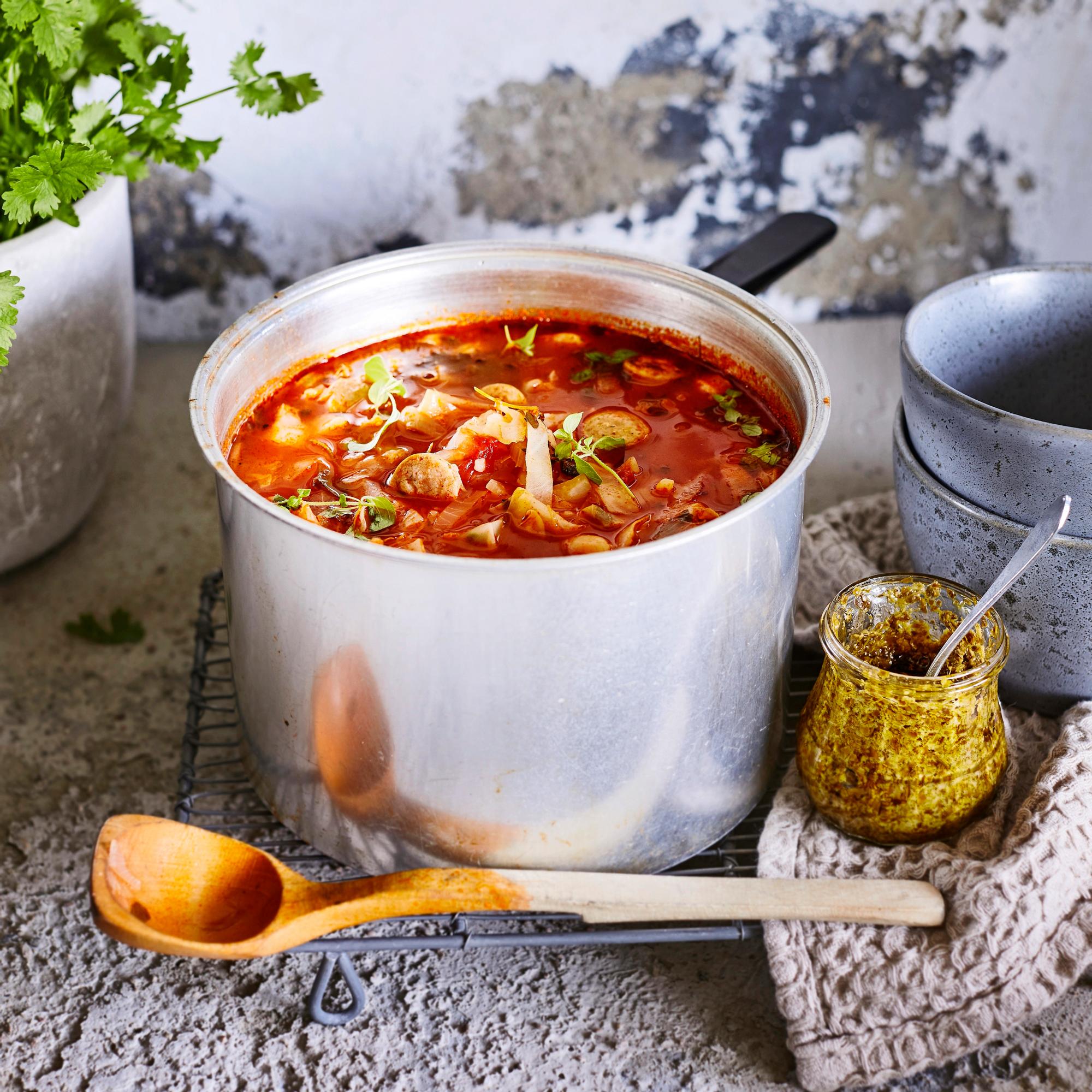 Valmista valkokaalista, raakamakkarasta ja gochujang-chilitahnasta lämmittävä ja mausteinen korealainen kaalikeitto. Lisää potkua keittoon tuovat inkivääri, valkosipuli ja seesamiöljy.