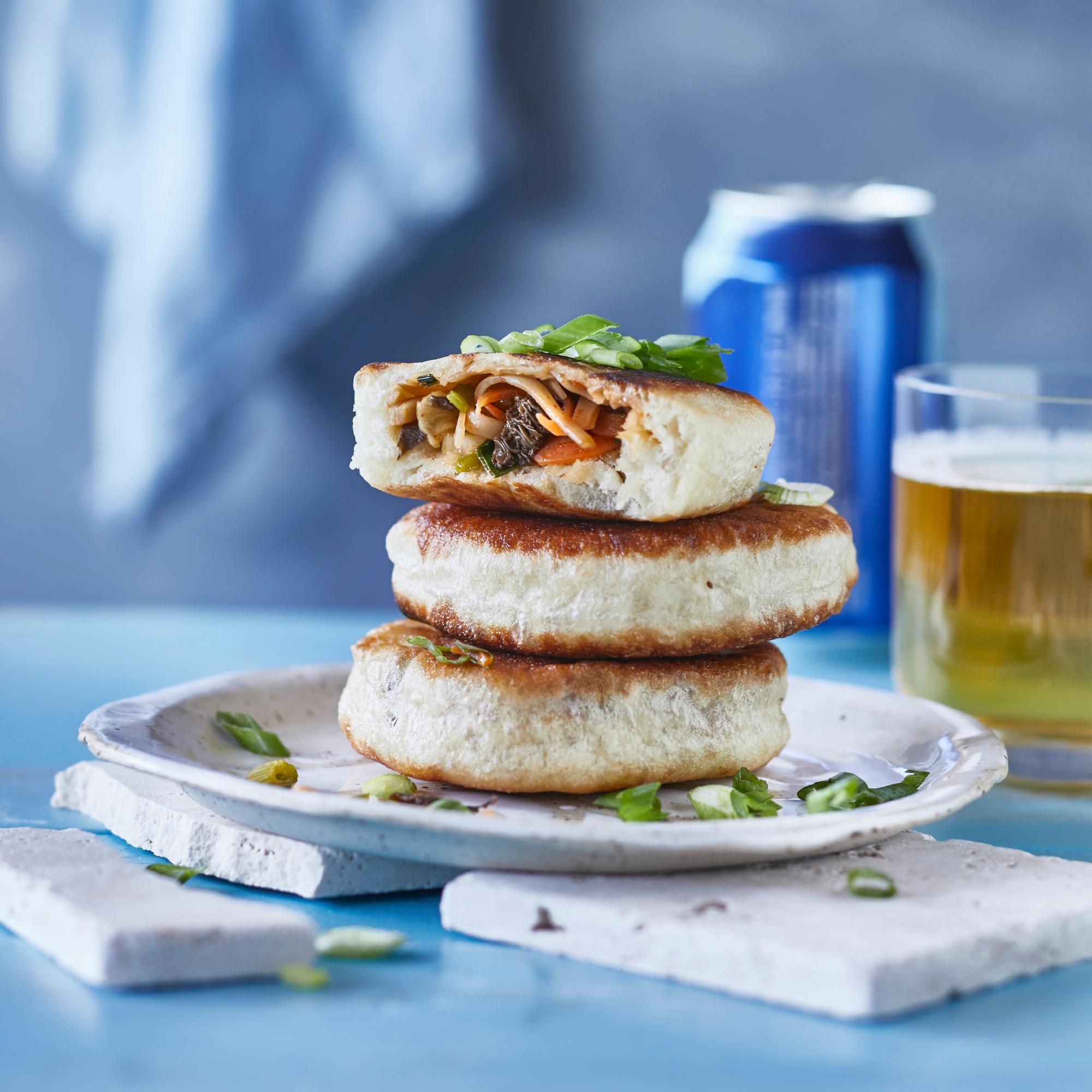 Korelaiset pannukakut kätkevät sisäänsä suppilovahveroita, nuudeleita, porkkanaa, kevätsipulia ja rutkasti mausteita, joista tärkein on gochujang-chilitahna. Perinteisten hotteokien suolaiset versiot sopivat mainiosti myös brunssille.