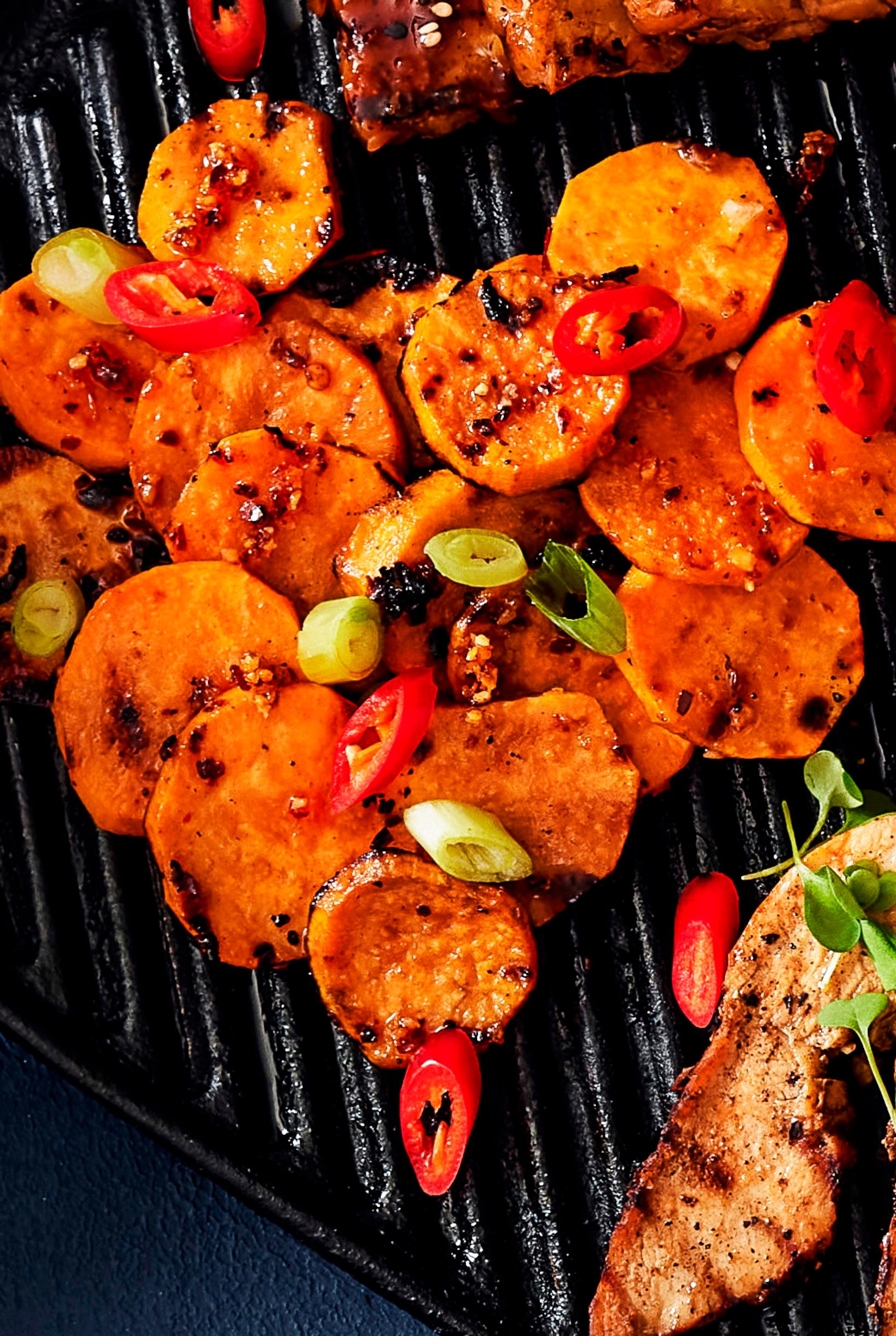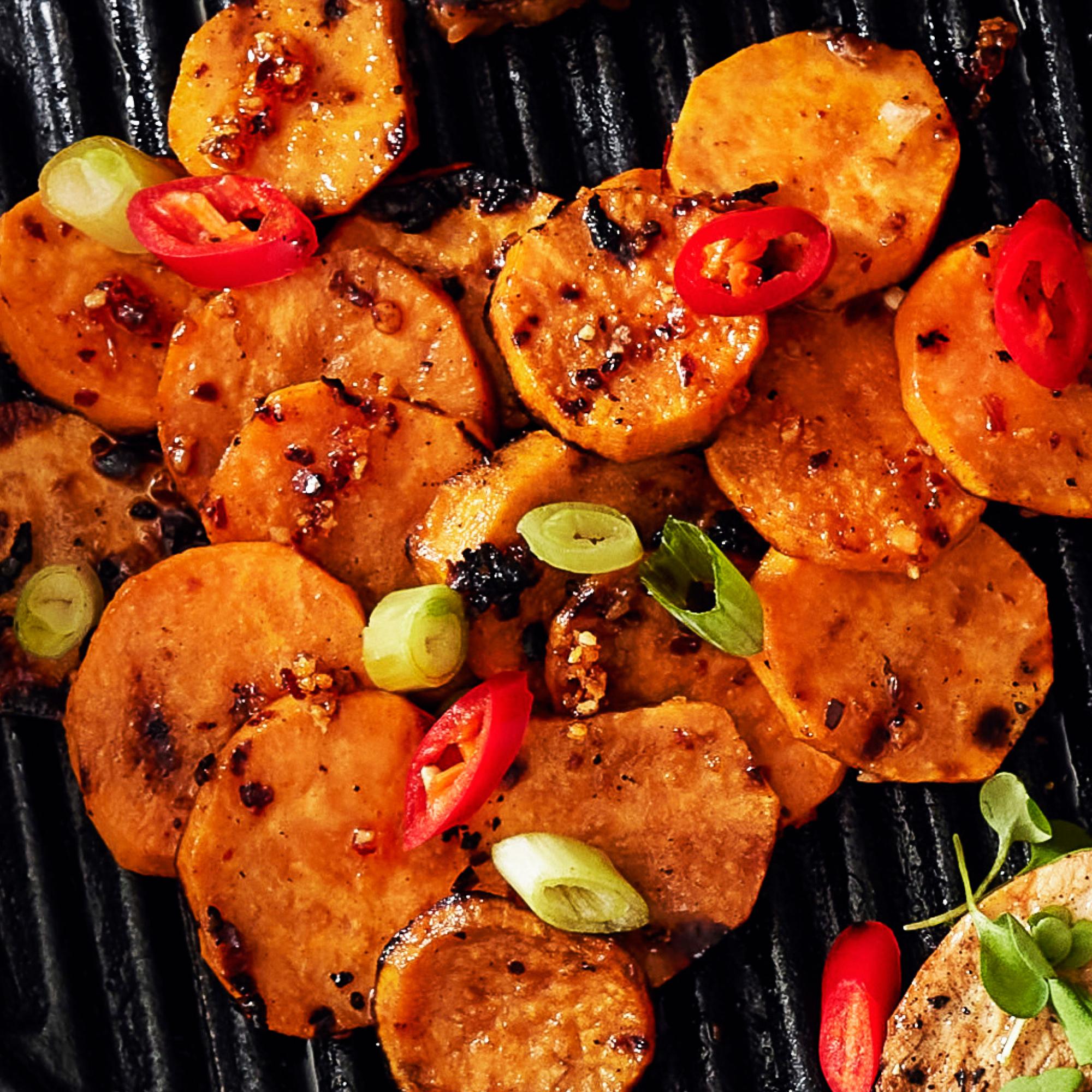 Näissä bataateissa on rapeutta tuplasti: sekä chiliöljyssä että paistopinnassa. Grillaa bataatit öljytyllä (parila)pannulla molemmin puolin kypsäksi tai jos sinulla on pöytägrilli, nosta se pöydän keskelle ja anna jokaisen ruokailijan osallistua grillaukseen.