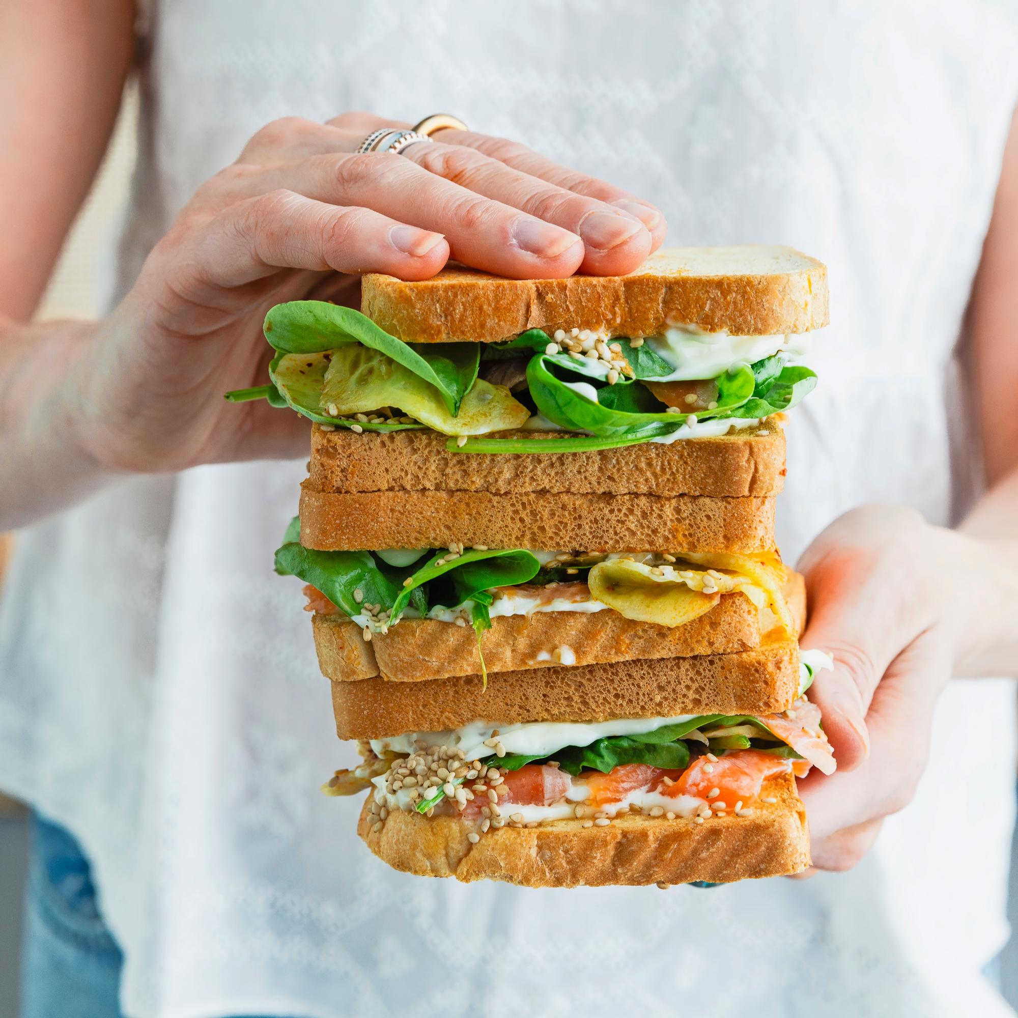 - Voitele kaikki leivät majoneesilla. Painele pinaatti neljälle leivälle ja nosta lohiviipaleet päälle. Lusikoi kurkkuja leiville, ripottele seesaminsiemeniä päälle ja nosta toiset neljä leipäviipaletta kansiksi.