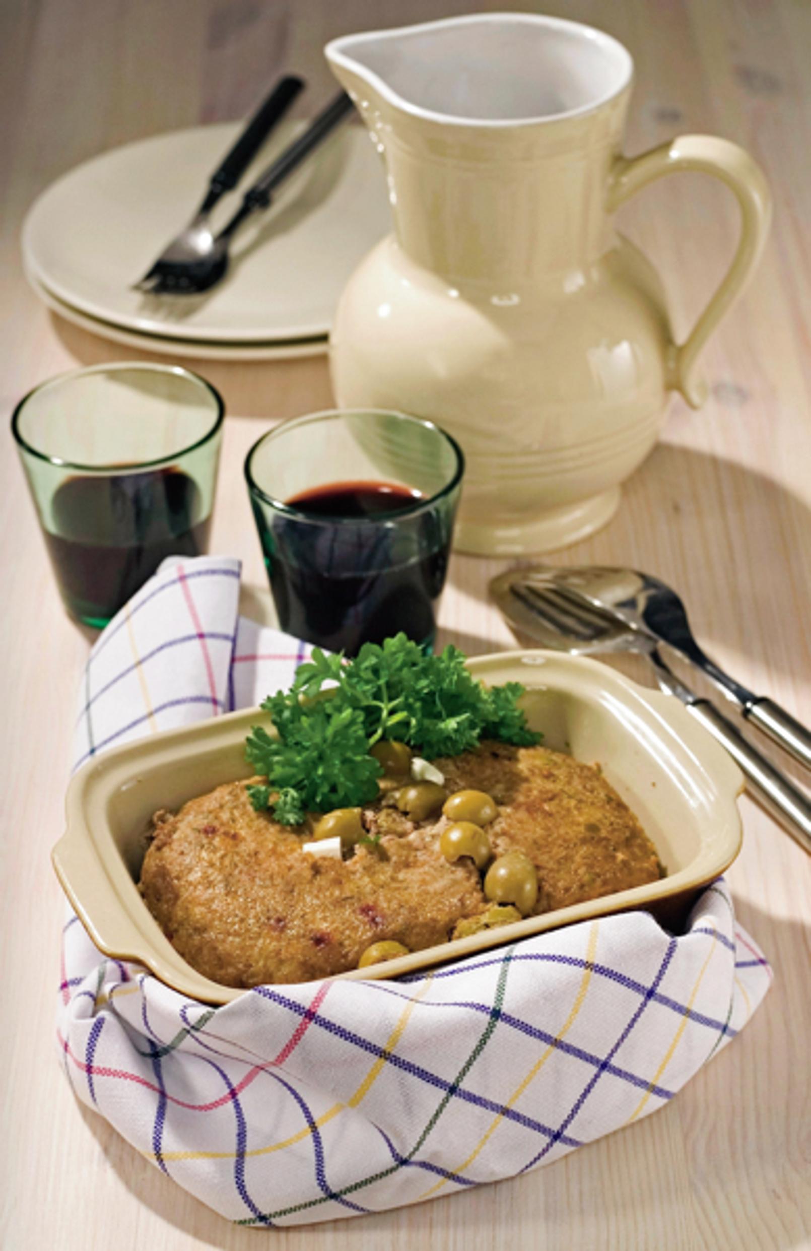 Pane kevyesti öljyttyyn leipävuokaan jauheliha tasaisesti pohjalle ja sen päälle eri kulmiin muut aineet. Kaada lopuksi vesi kaiken päälle. Siirrä vuoka koneeseen. Käynnistä lyhyt ohjelma, joka sekoittaa ensin taikinan. Jos taikina vaikuttaa kuivalta, lisää vettä. Anna koneen paistaa patee kypsäksi. Kumoa vähän jäähtyneenä. Poista sekoitin varovasti ja täytä muodostunut kolo oliiveilla ja yrteillä.