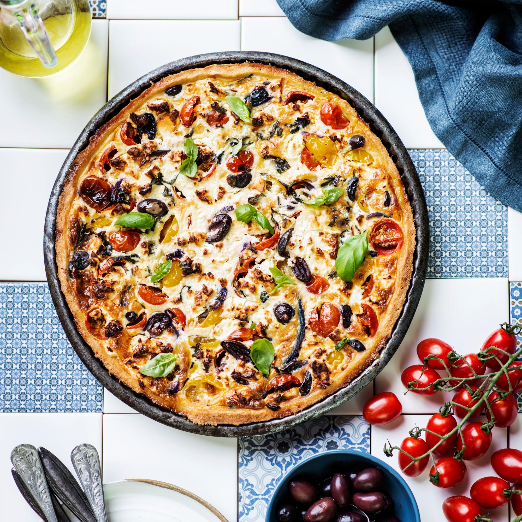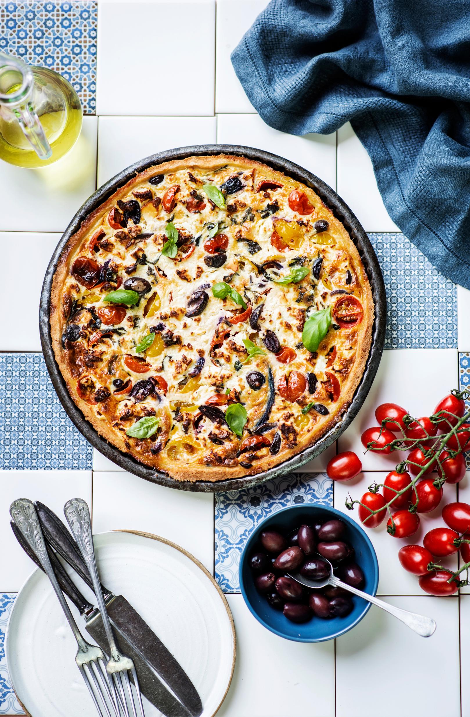 Tässä suolaisessa kasvispiirakassa maistuvat Kreikan maut. Täytteessä ihastuttavat suolainen fetajuusto, makeat kirsikkatomaatit, punasipuli ja kalamataoliivit, nam!