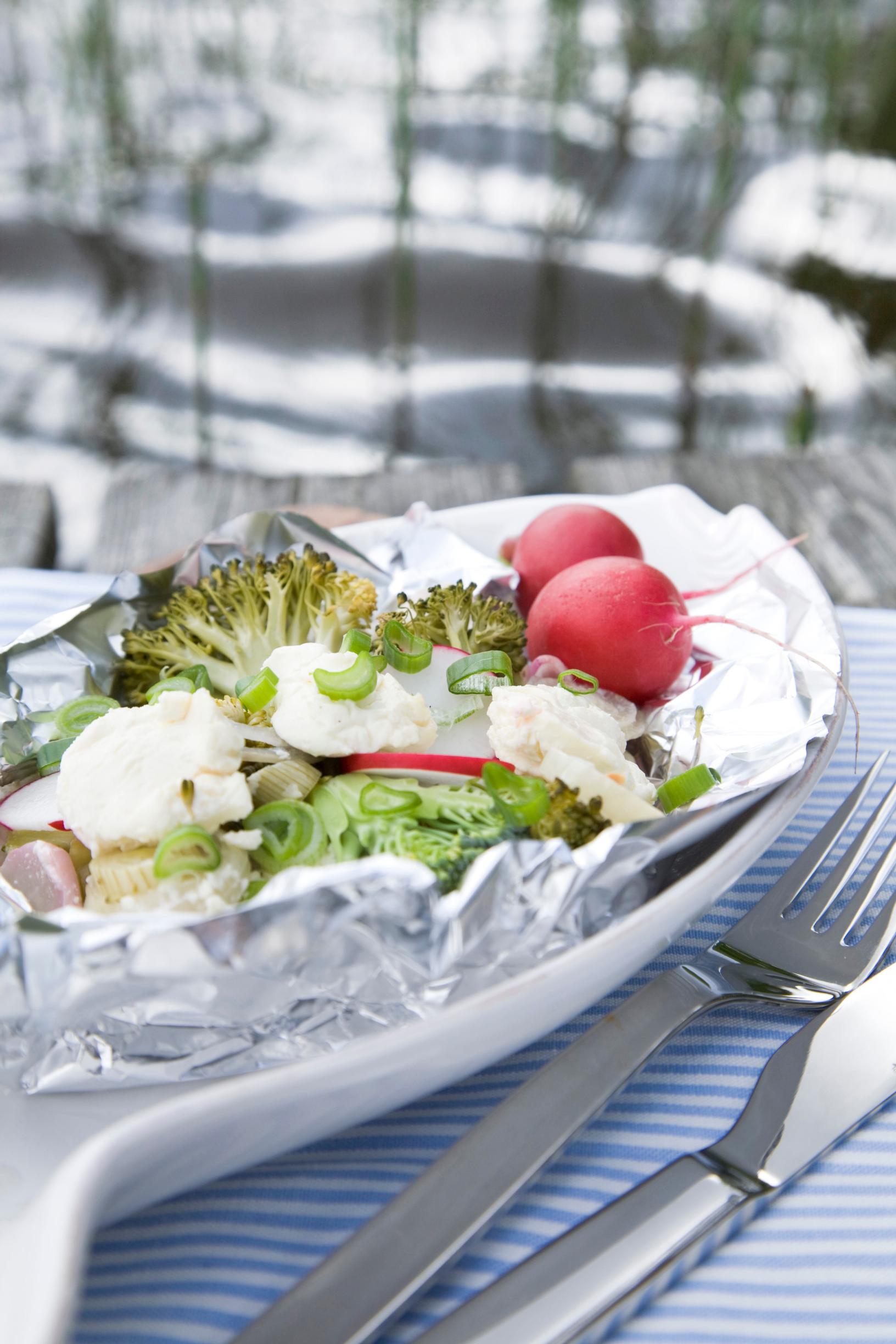 Revi foliosta 4 palaa. Asettele kasvisviipaleet kalafileiden päälle folionyytteihin. Lusikoi tuorejuustonokareet ja hienonnettu basilika pinnalle. Jos valmistat kuhanyytit grillissä, laita kalat ja kasvikset kaksinkertaisiin folioihin.
