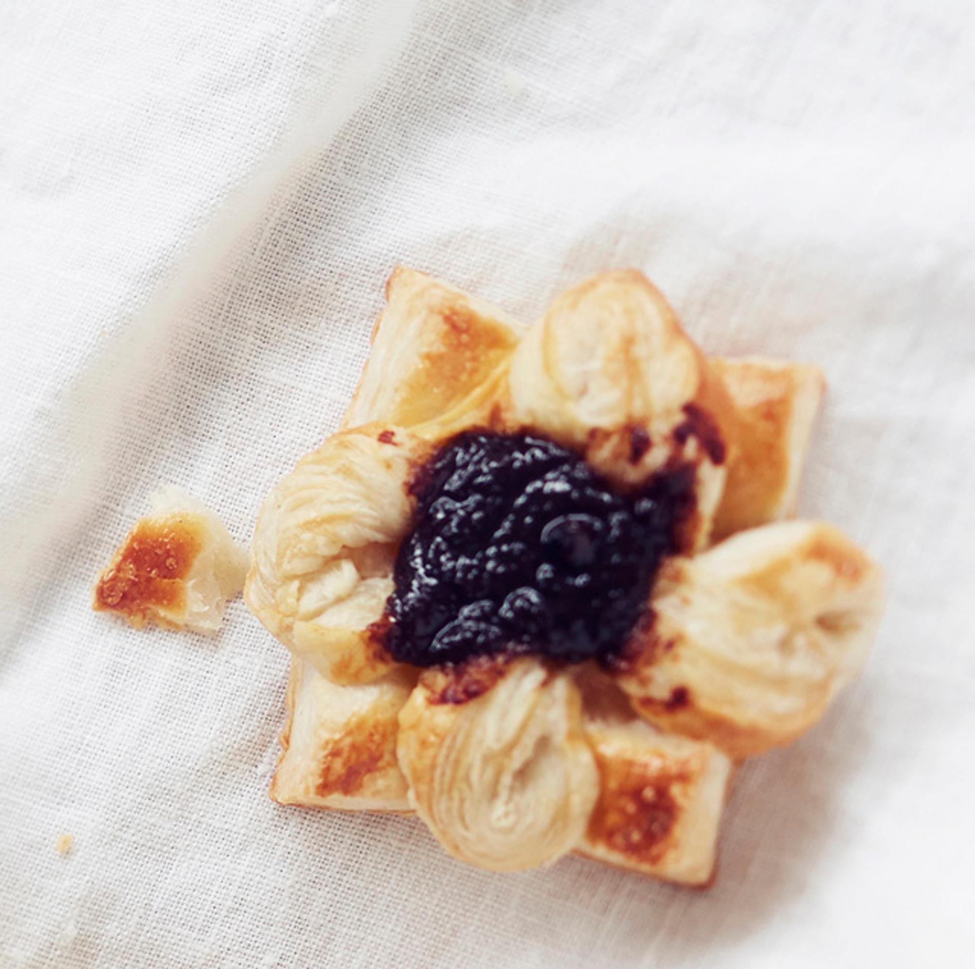 10. Kauli taikina ohuehkoksi levyksi ja muotoile siitä taikinapyörän avulla kuvan mukaisia kukkia. Lisää keskelle lusikalla luumuhilloa.
