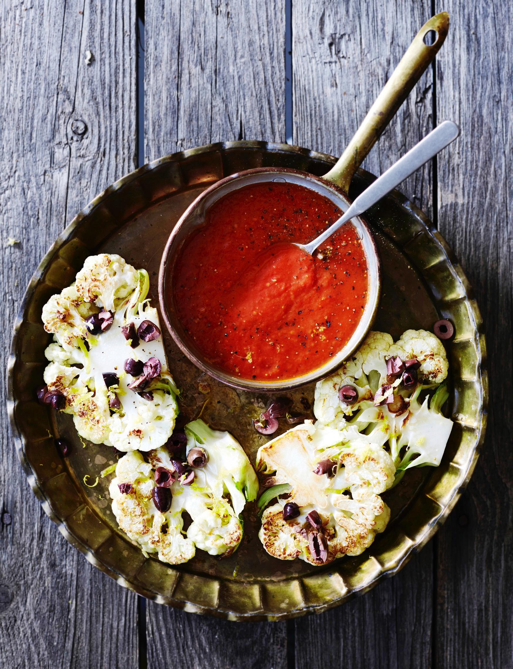 - Mausta suolalla, pippurilla, sitruunankuorella ja mehulla. Ripottele kukkakaalipihvien päälle oliivisilppua.