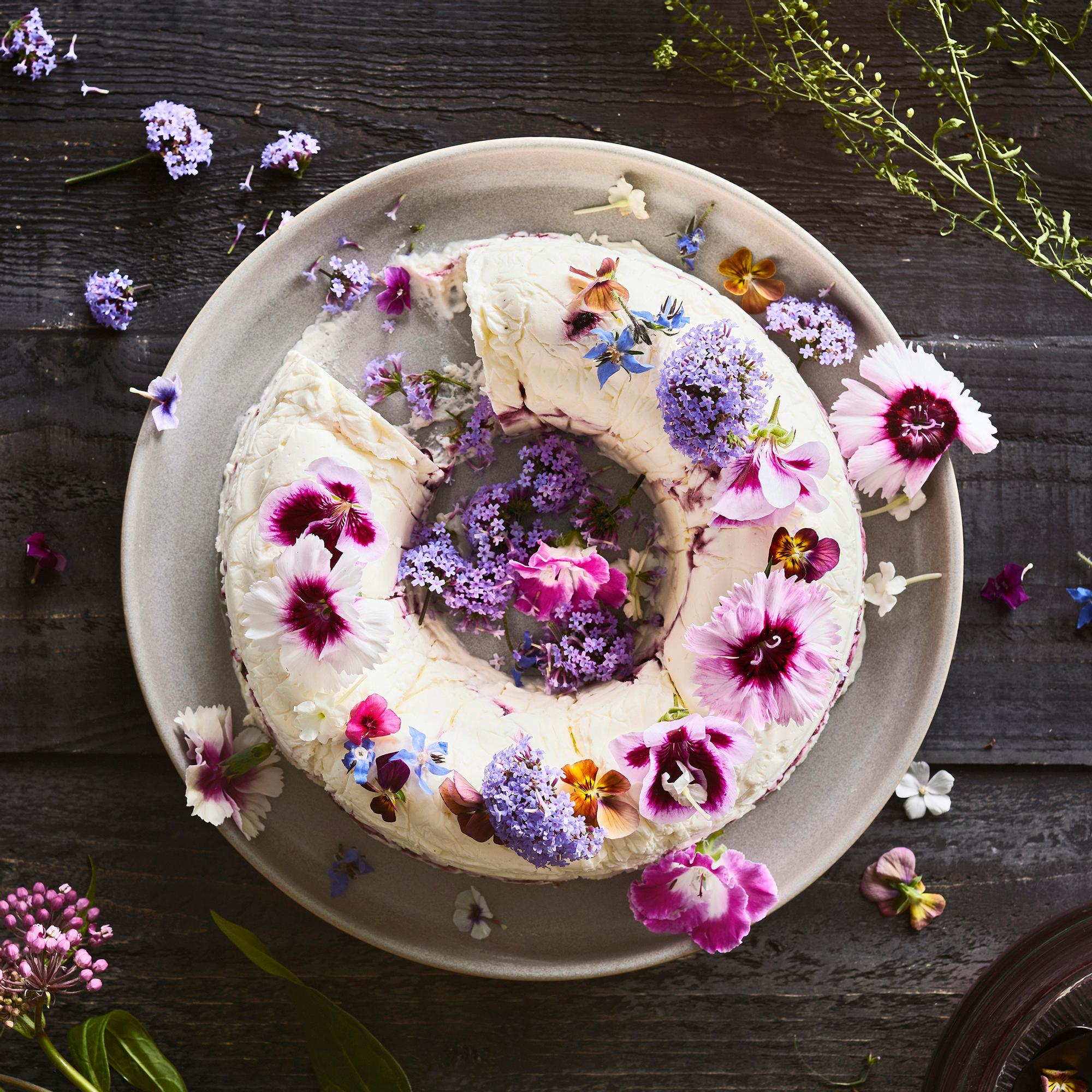 - Ota jäädyke pakastimesta, avaa kelmut ja kumoa tarjoiluvadille. Koristele syötävillä kukilla.