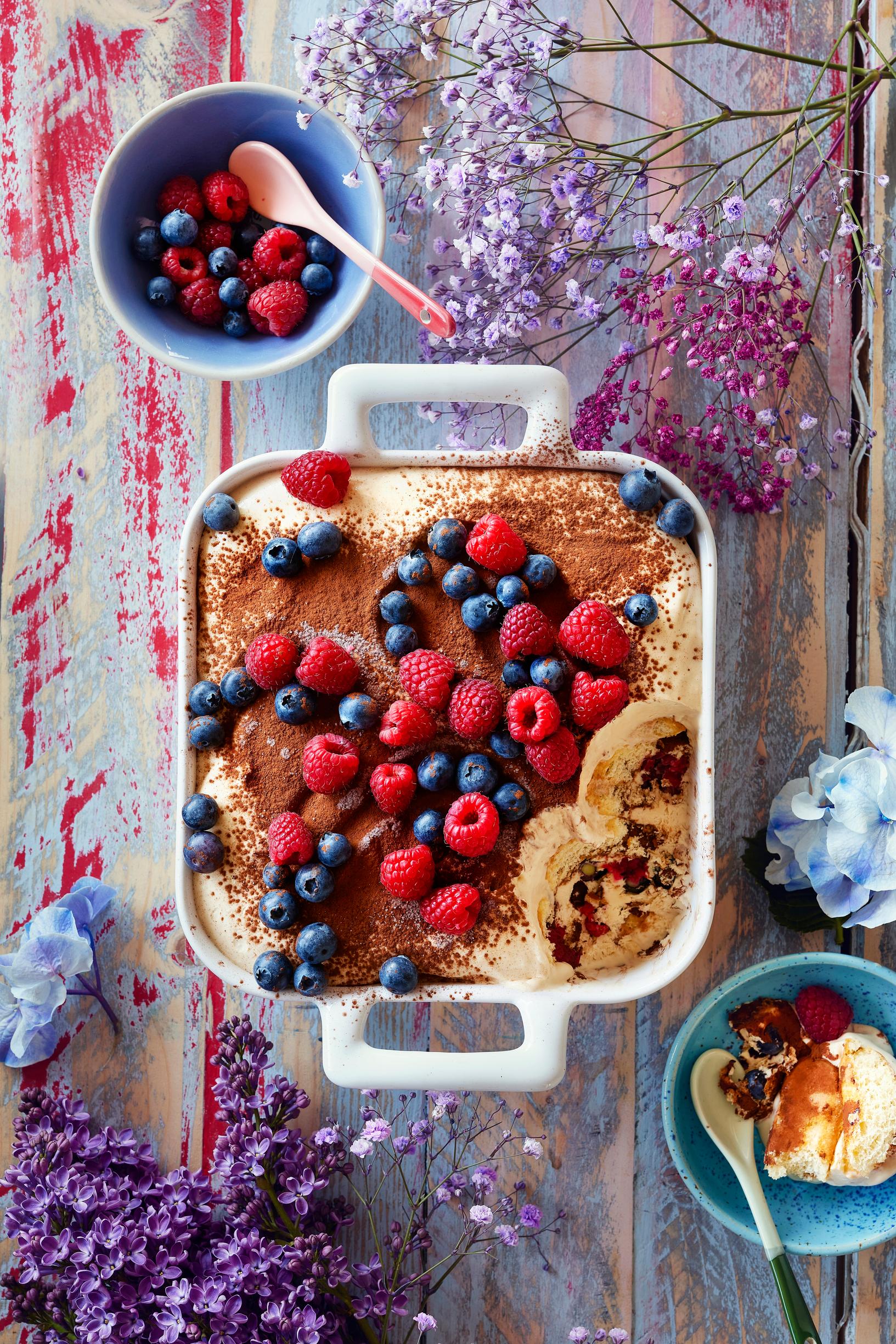 Tiramisun ystävän uusi lemppari on vuokaan koottava jäätelökakku vadelmilla ja mustikoilla viritettynä. Kuningattaren tiramisujäätelökakku on nopea valmistaa. Nappaa resepti!