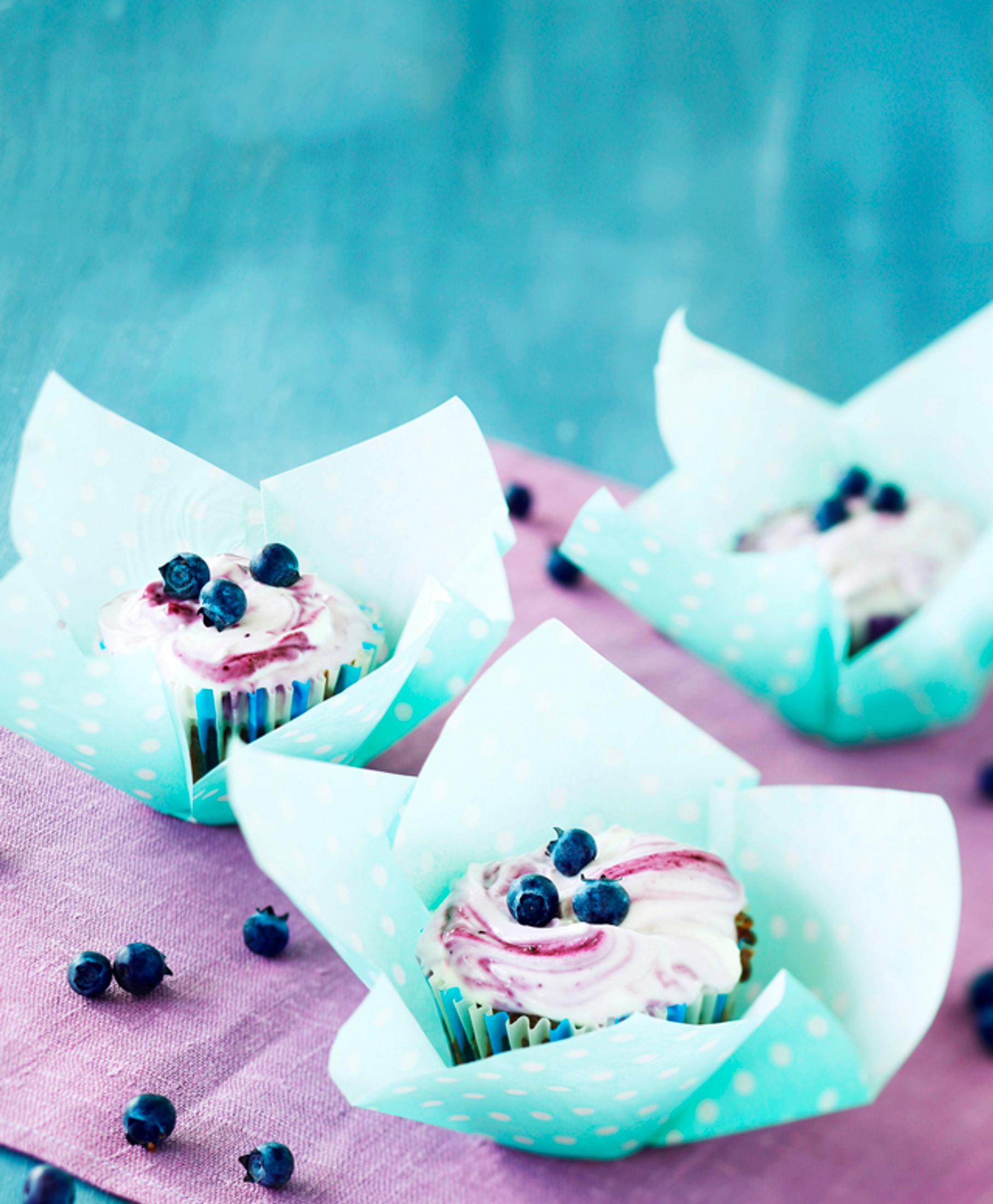 Saat mustikkamuffinien kuorrutukseen kauniit raidat, kun kääntelet mustikkasoseen vain kevyesti tuorejuusto-tomusokeriseoksen joukkoon.